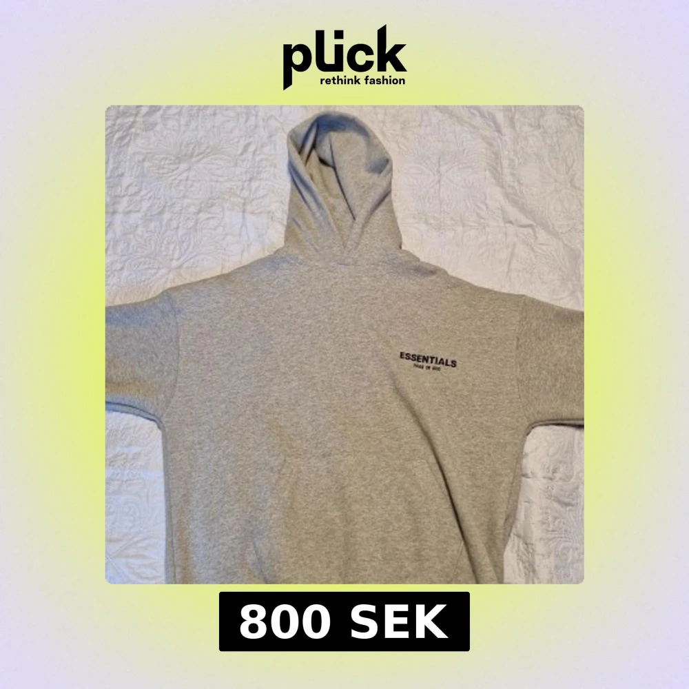 Säljer en grå hoodie från Essentials Fear of God med svart logga tryckt både fram och bak. Klassisk passform med huva och känguruficka. Perfekt för dig som gillar streetwear och vill ha en stilren look. Är en S men passar M