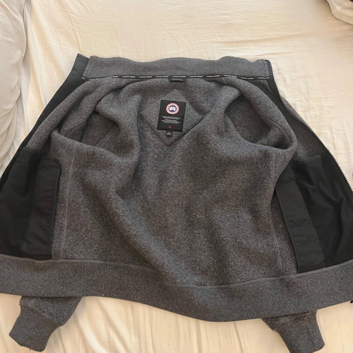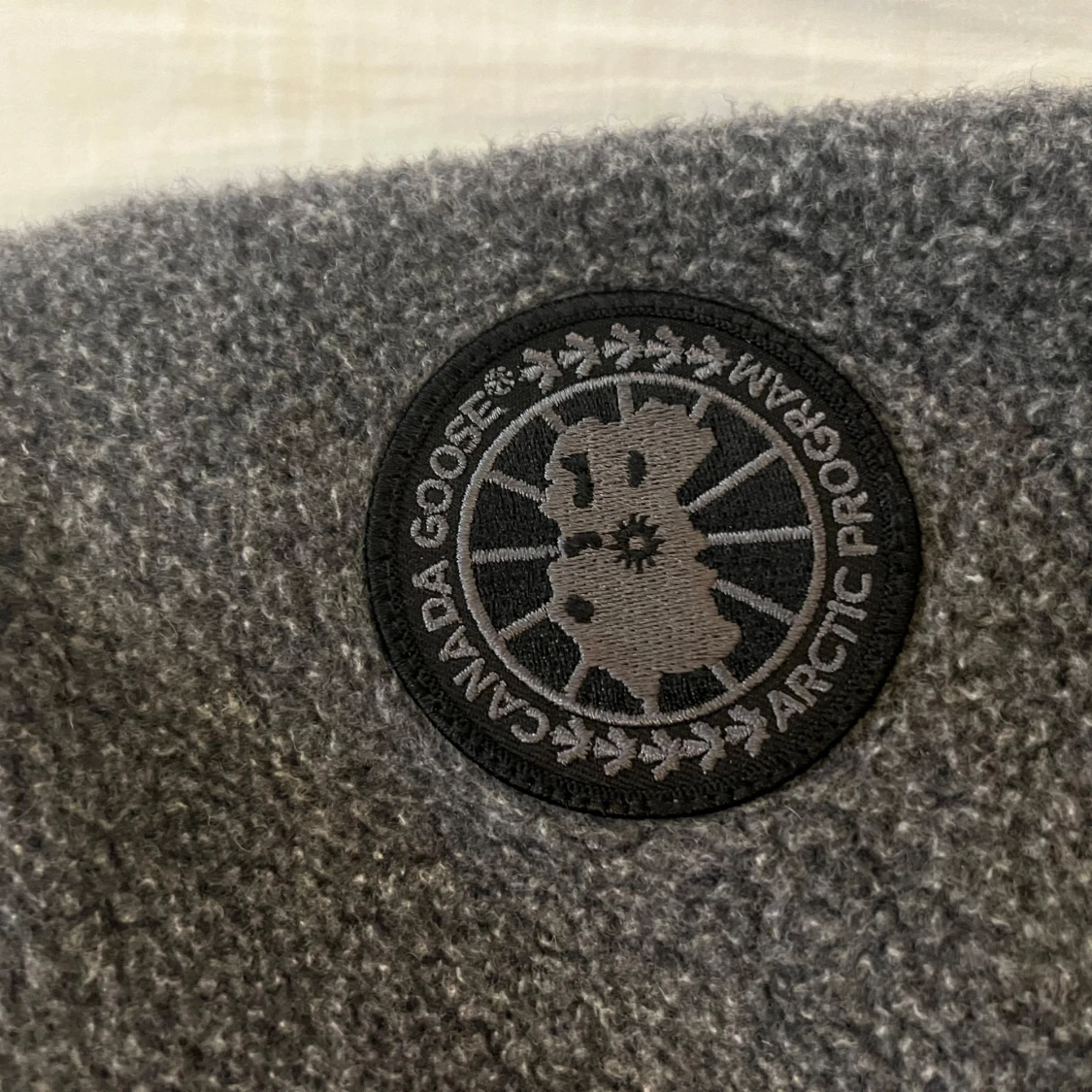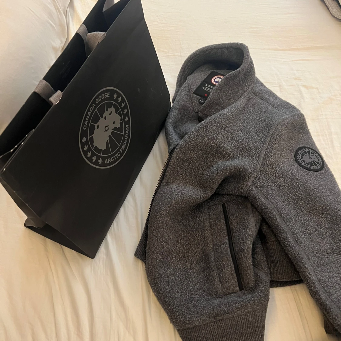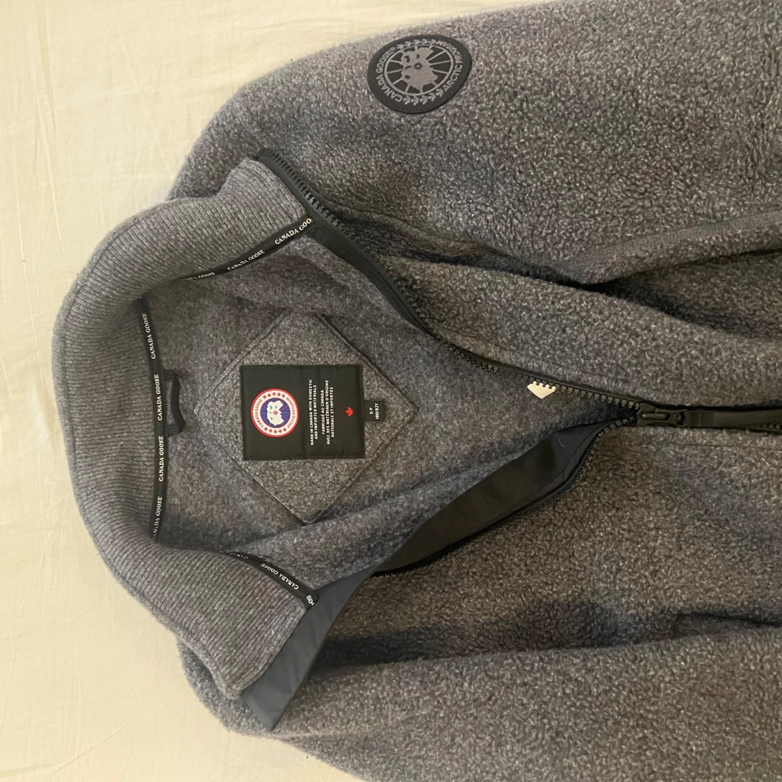 Säljer en grå fleecekofta från Canada Goose med broderad logga på ärmen. Koftan har ribbade muddar, hög krage och hel dragkedja framtill. Materialet är mjukt och värmande, perfekt för kyliga dagar. Kvitto och andra bevis på produktens äkthet tillgängliga. Storlek S, men passar även bra för M
