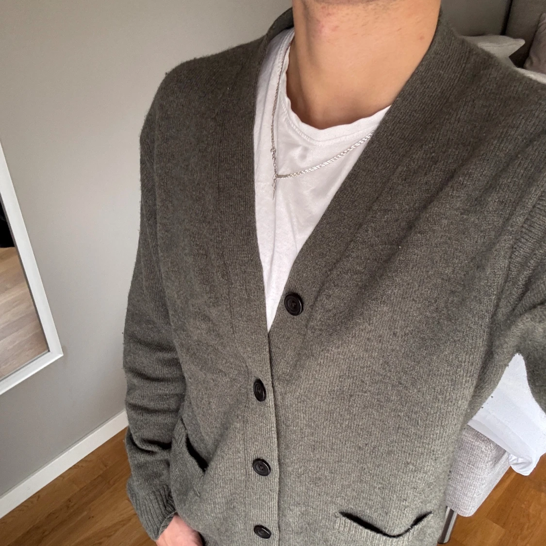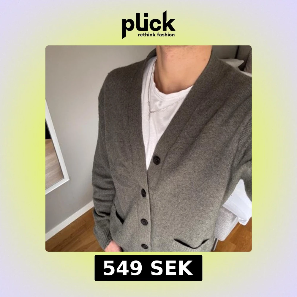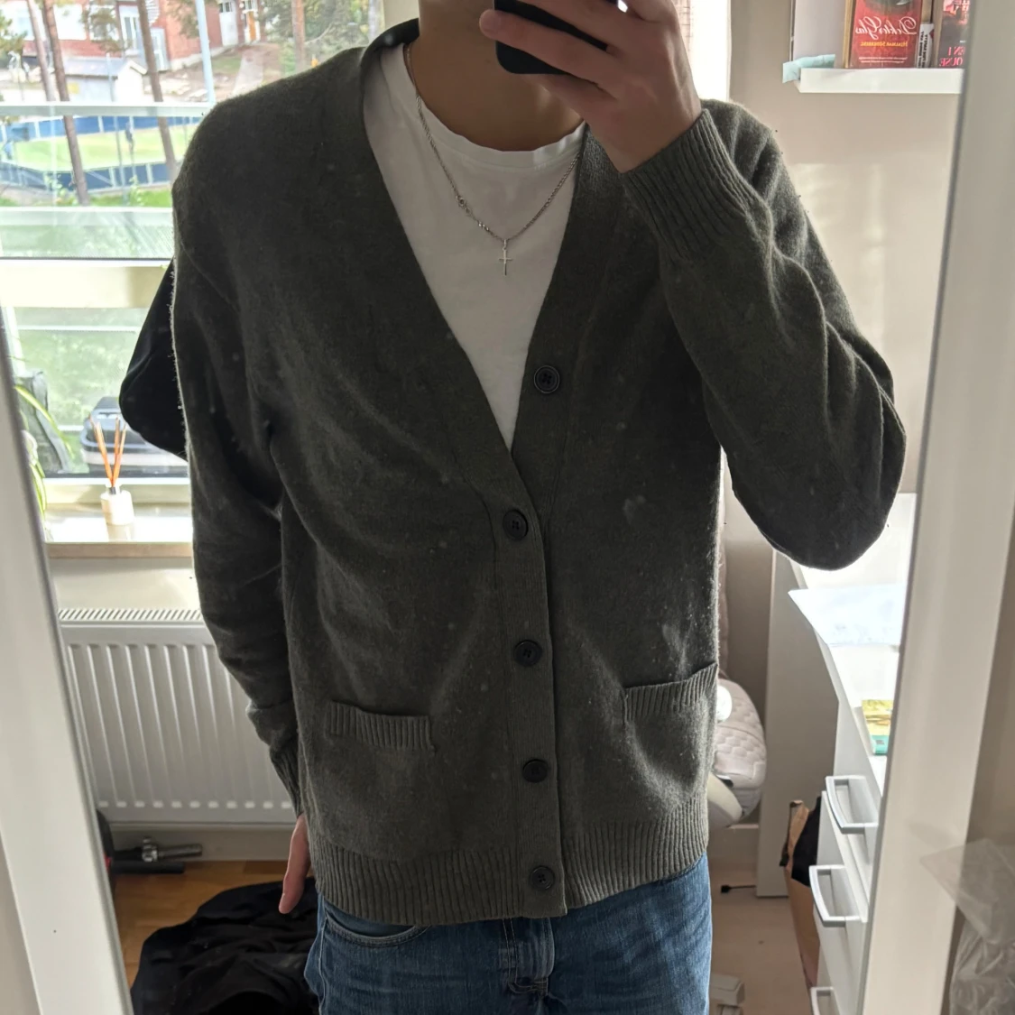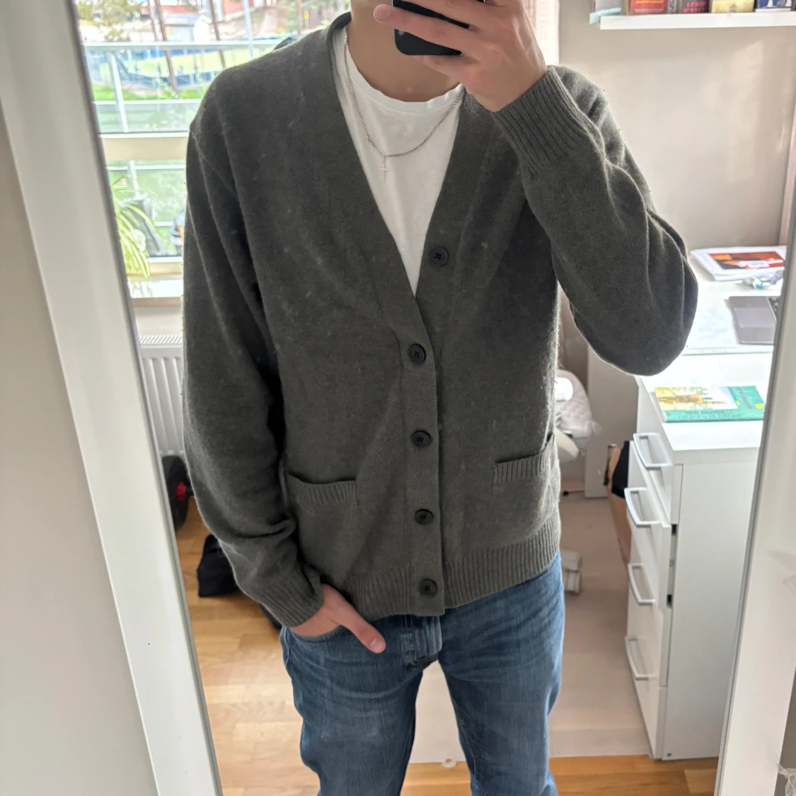 Mysig grå kofta med v-ringning och stora svarta knappar framtill. Koftan har två fickor och ribbade muddar vid ärmslut och nederkant. Perfekt att slänga på sig över en t-shirt för en chill och stilren look. Priset är diskuterbart
