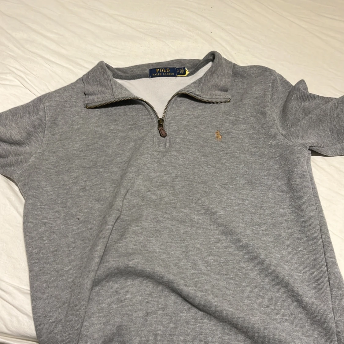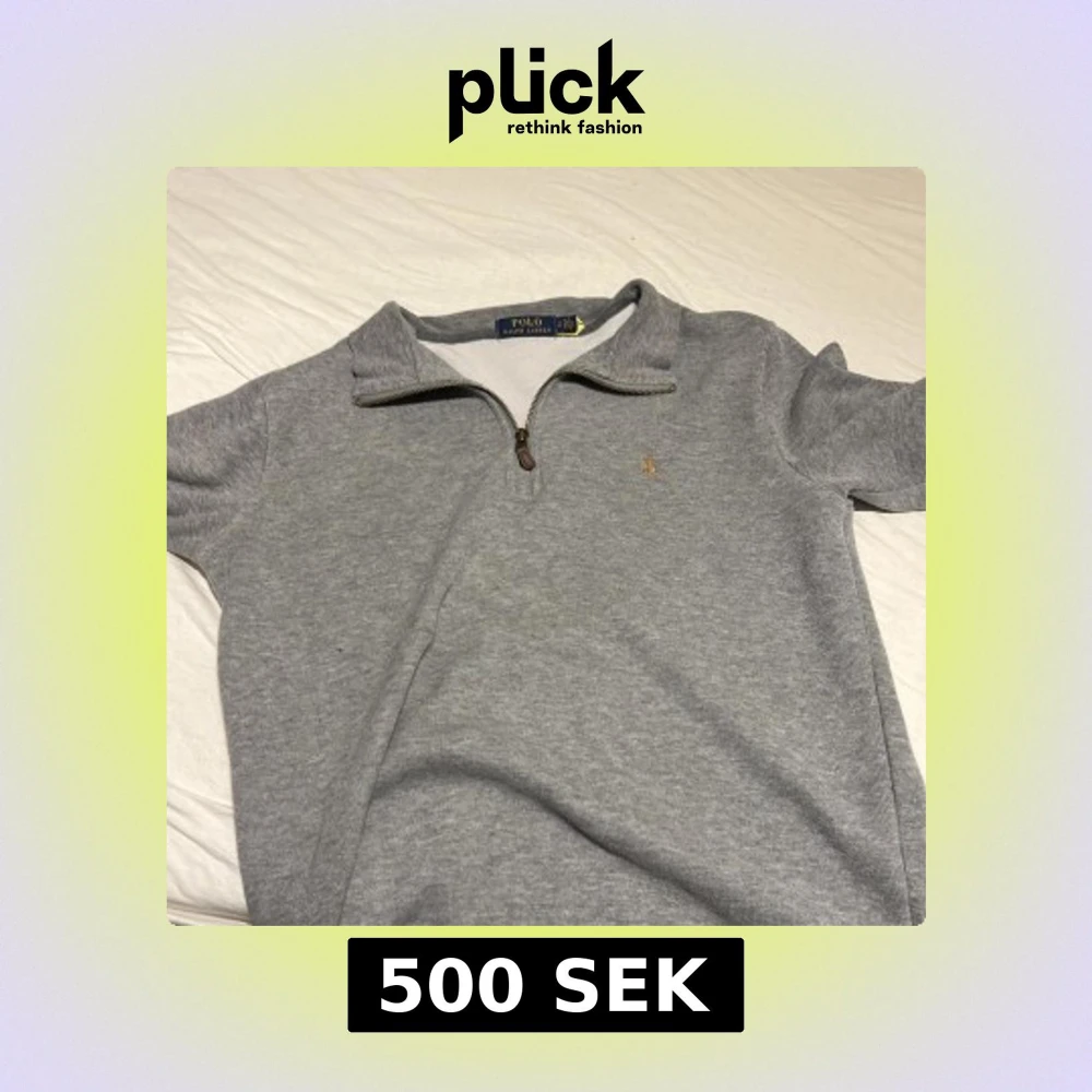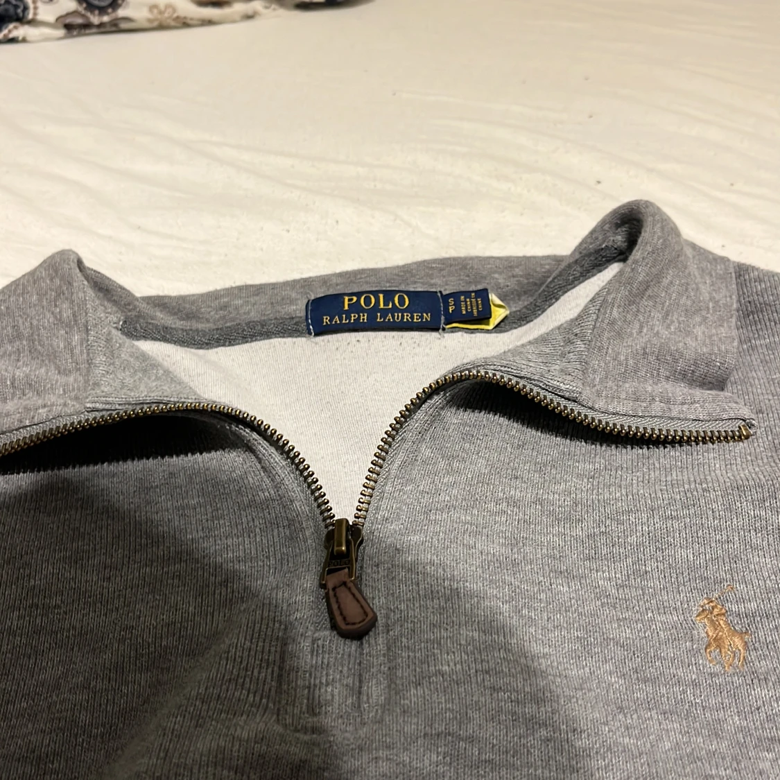 Säljer en stilren grå tröja från Polo Ralph Lauren med klassisk broderad logga på bröstet. Tröjan har half zip-dragkedja och är tillverkad i mjuk bomull. Perfekt för lager-på-lager och chill vardagsstil.