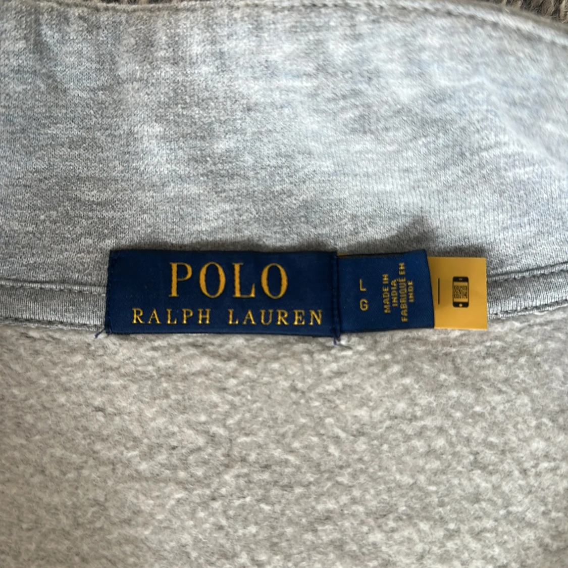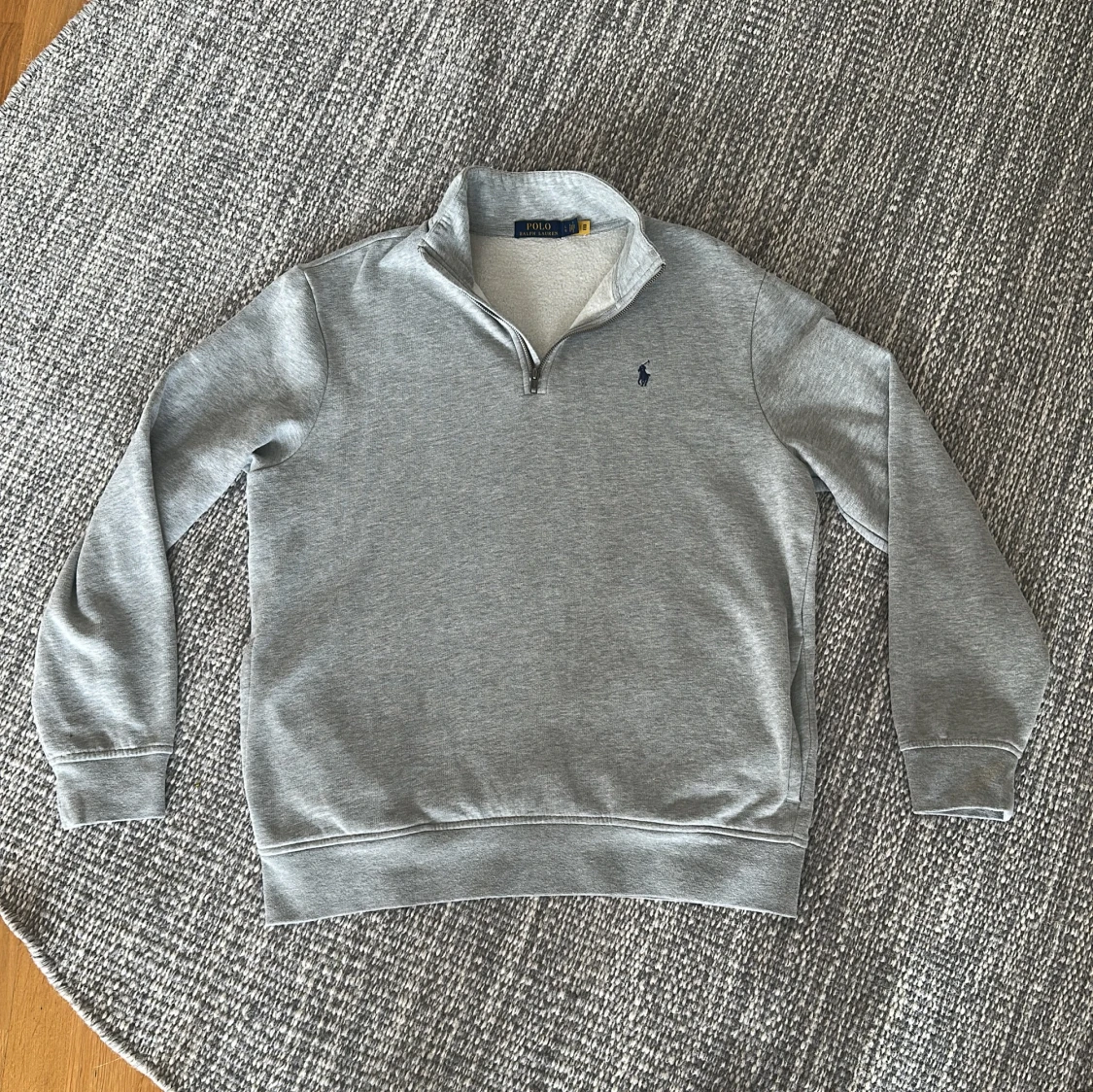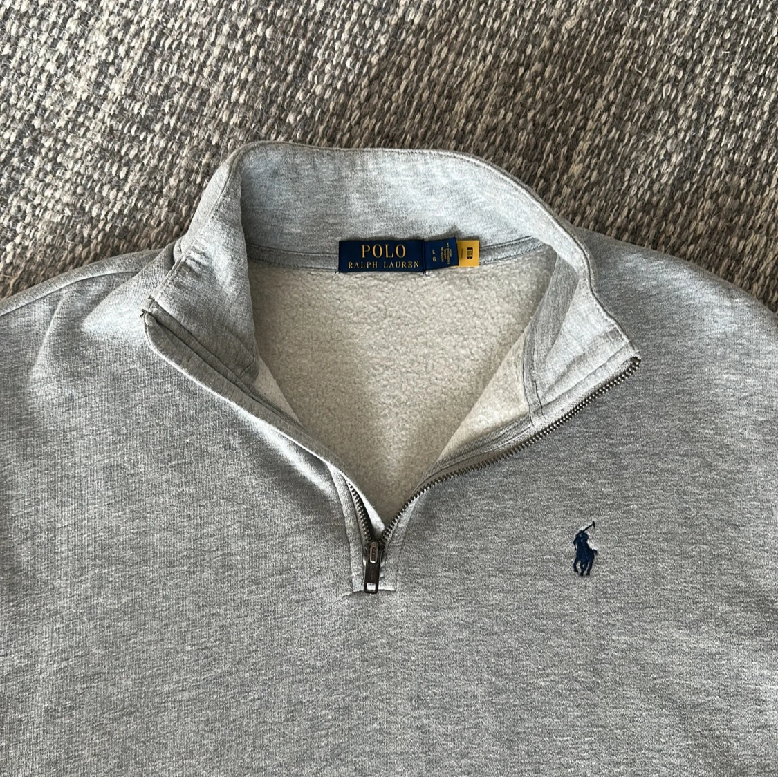 Snygg grå långärmad tröja från Polo Ralph Lauren med half zip och broderad marinblå logga på bröstet. Mjuk insida och klassisk passform, perfekt för lager-på-lager. Passar dig som gillar stilren och enkel design.