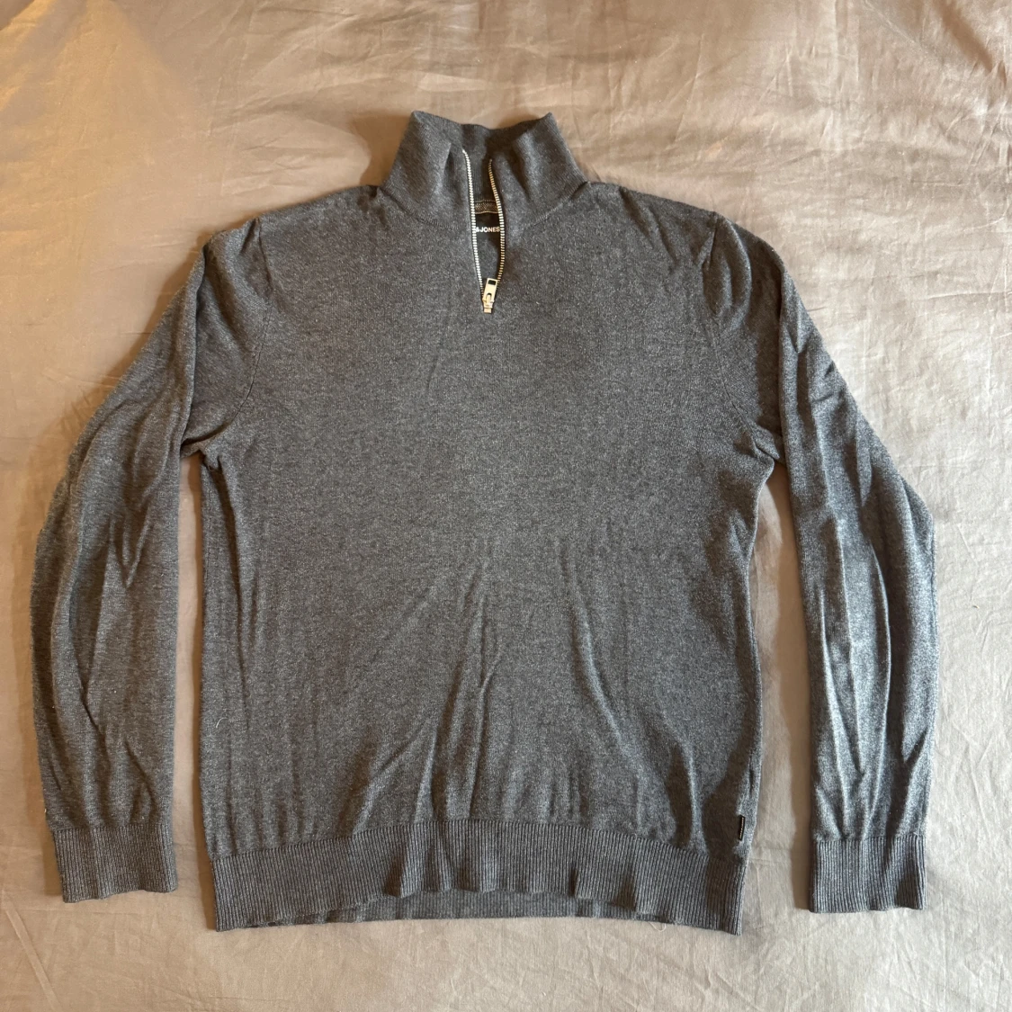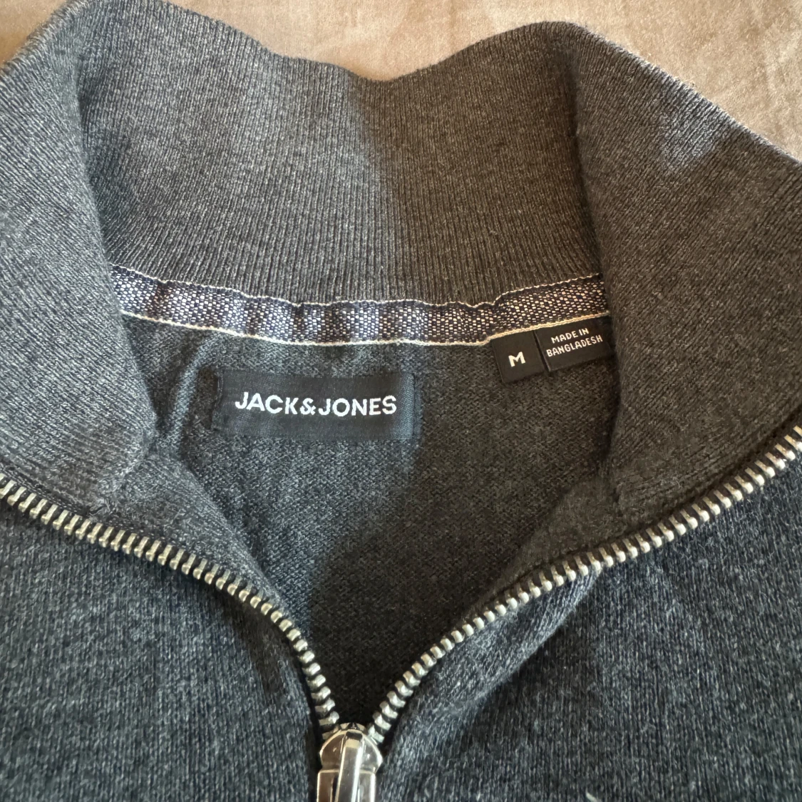 Mörkgrå stickad tröja från Jack & Jones med half zip och hög krage. Tröjan har lång ärm, ribbade muddar och är i mjukt material. Enkel och stilren design som funkar till många outfits.