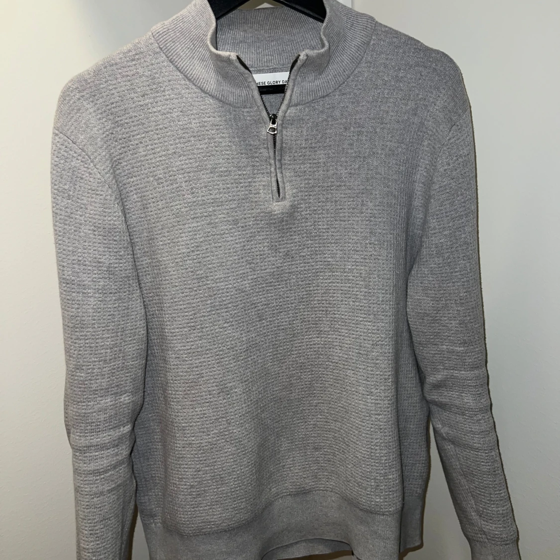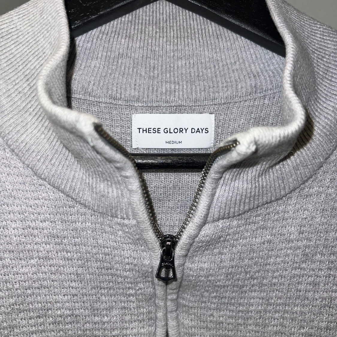 Snygg grå stickad tröja från These Glory Days med dragkedja vid halsen. Perfekt för kyligare dagar med sin mjuka och bekväma passform. Tröjan har långa ärmar och en stilren design.