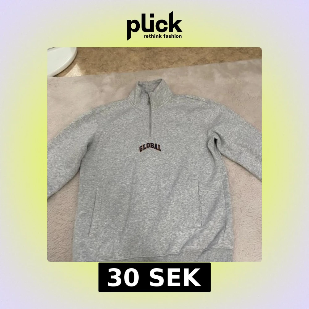 Gråmelerad sweatshirt från H&M med halv dragkedja och hög krage. Broderad text 'GLOBAL' på bröstet. Tröjan har långa ärmar och två fickor framtill. Perfekt för en avslappnad stil.
