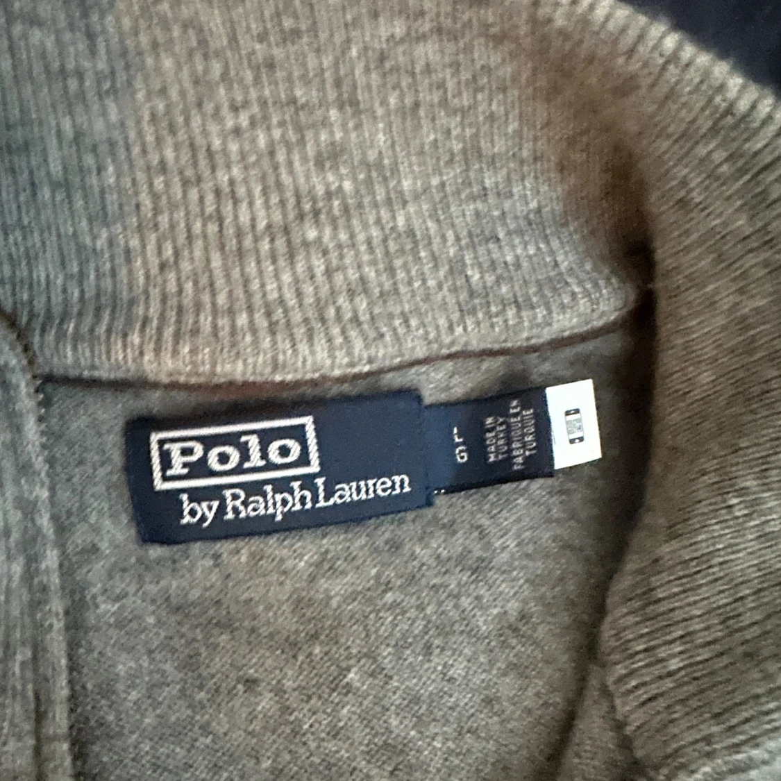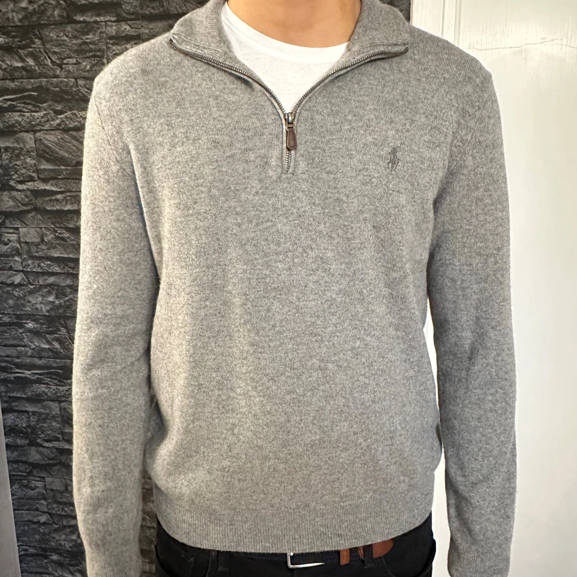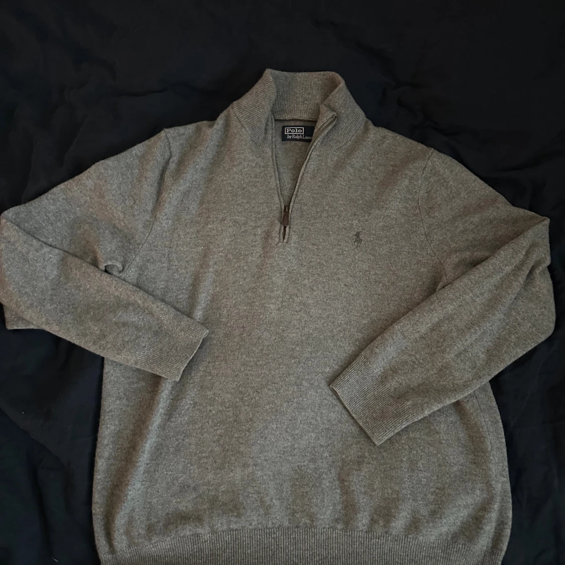 Snygg grå stickad tröja från Polo Ralph Lauren med half zip och diskret logga på bröstet. Tröjan har lång ärm, ribbade muddar och hög krage. Perfekt för lager-på-lager. Köpt på Åhléns, ny pris 2500kr
