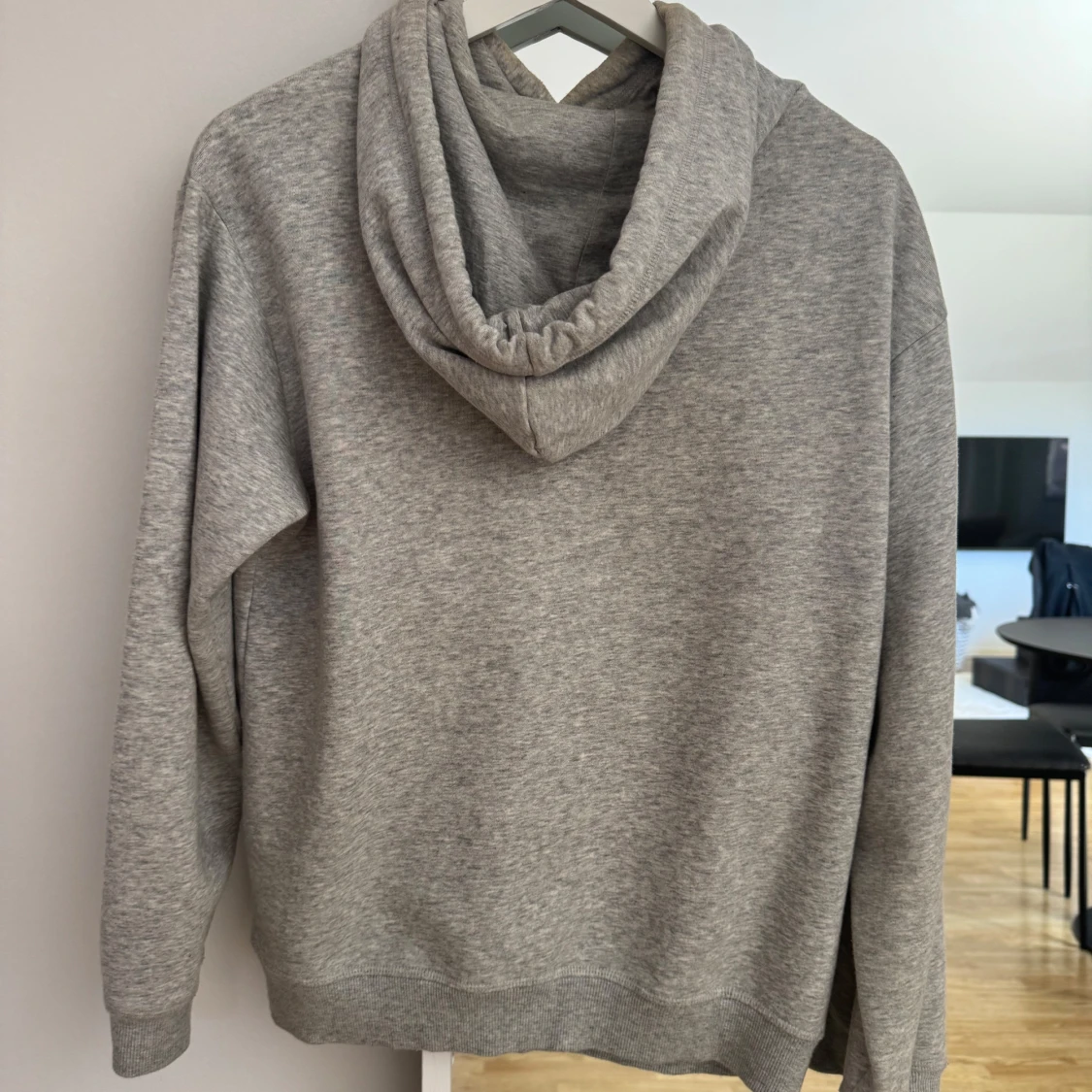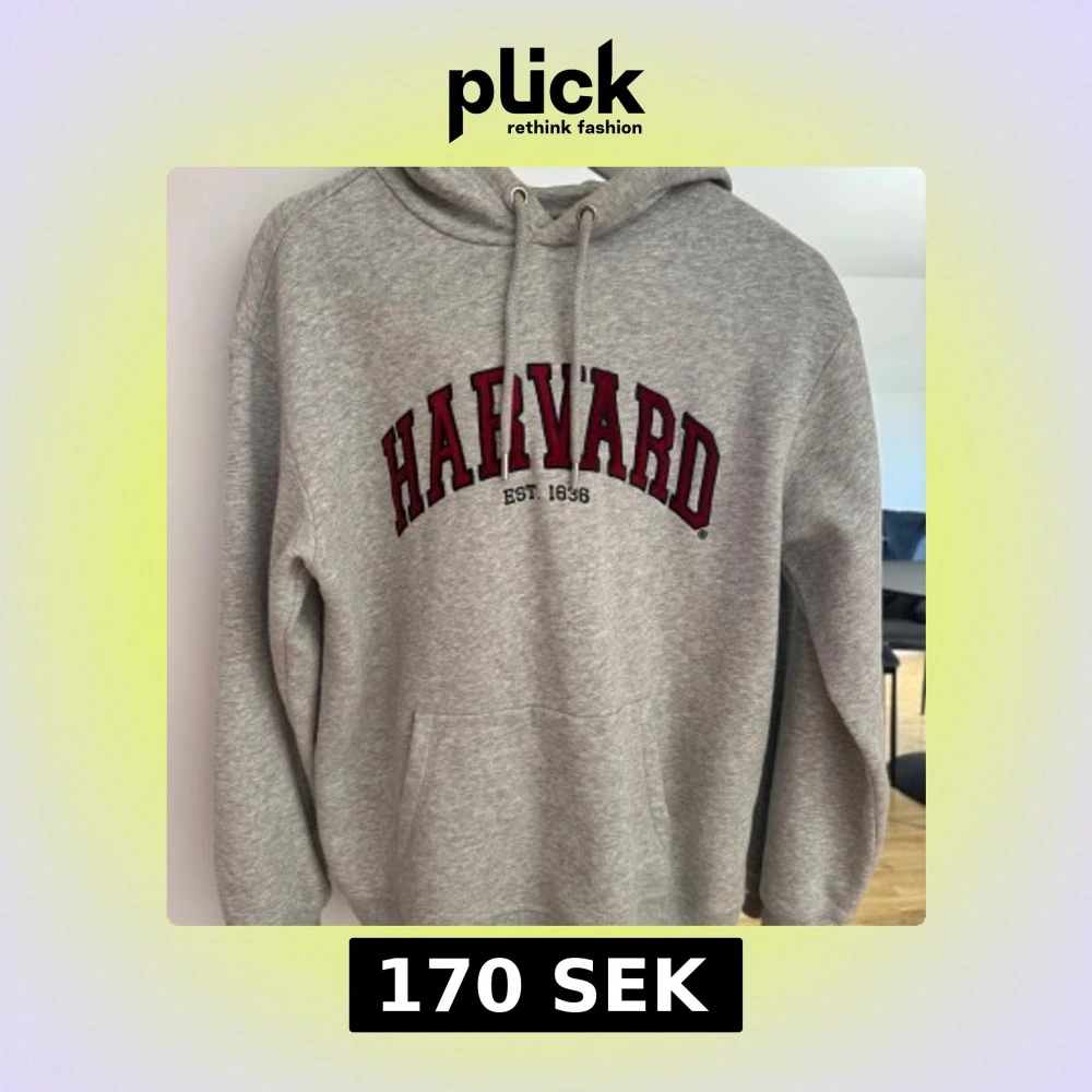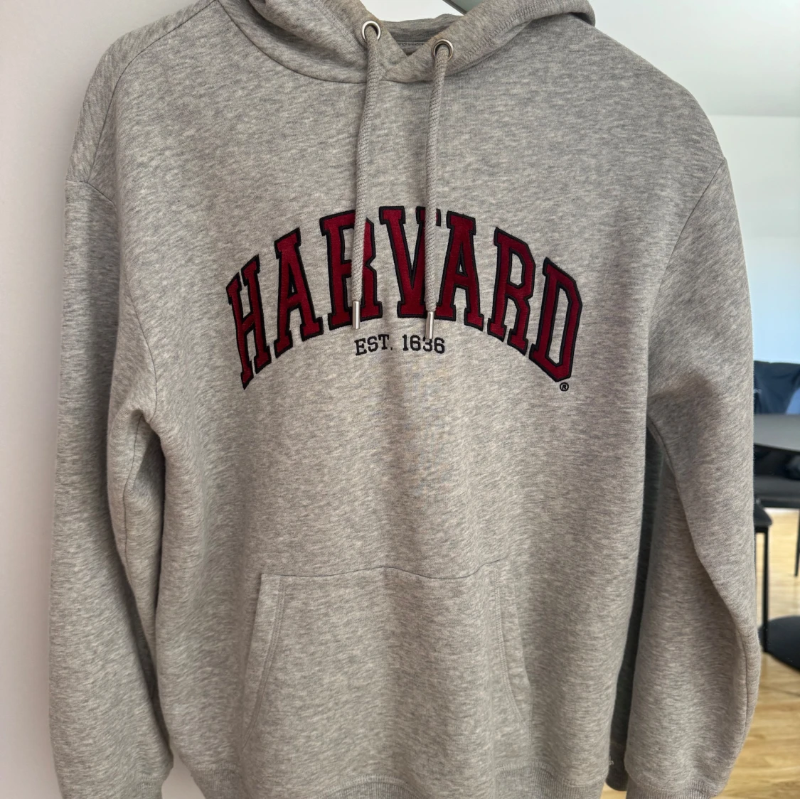 Säljer en klassisk grå hoodie med Harvard-tryck i rött och svart framtill. Tröjan har huva med dragsko och en stor magficka.