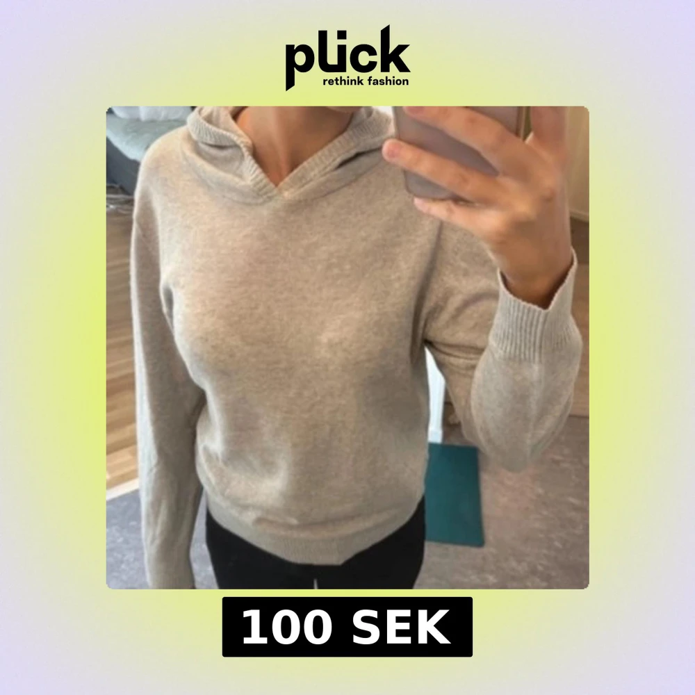 Säljer en mysig grå hoodie med långa ärmar och ribbstickade. Hör av dig vid intresse!