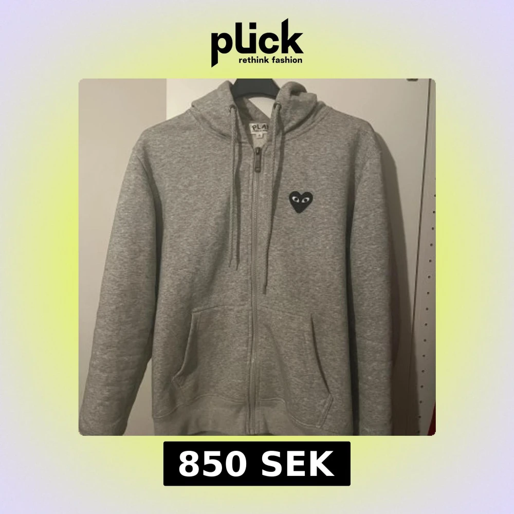 Grå hoodie från Comme des Garçons Play med dragkedja, huva och snörning. Ikoniskt svart hjärta med ögon på bröstet och stort hjärta på ryggen. Mjuk insida och känguruficka framtill. Perfekt för dig som gillar streetwear och stilrena detaljer.