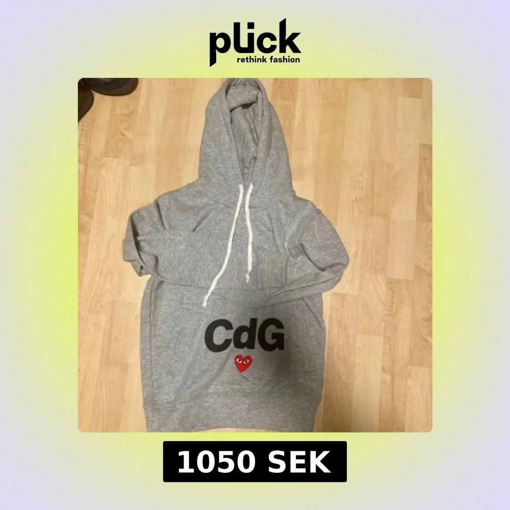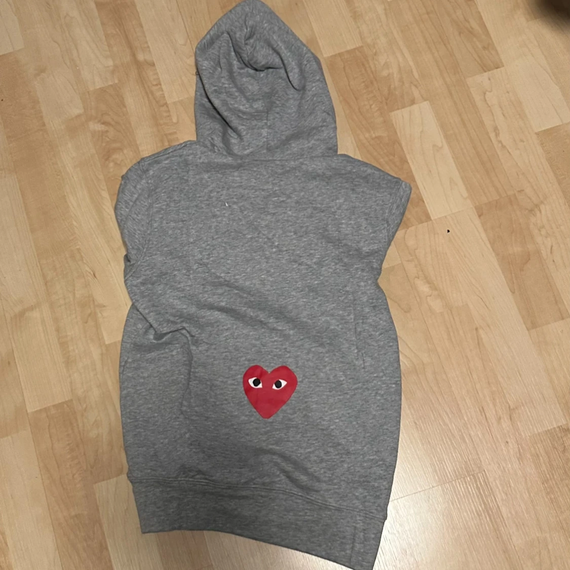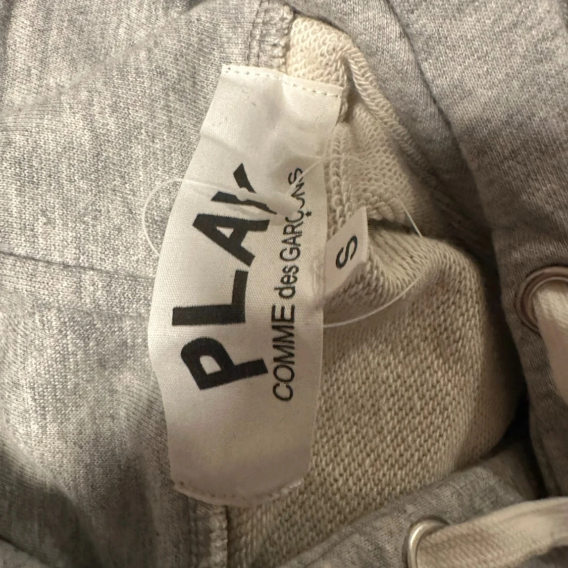 Grå hoodie från Comme des Garçons Play med vit snörning i huvan och svart CdG-tryck framtill. Ikoniskt rött hjärta med ögon både fram och bak. Mjuk bomullskvalitet och klassisk passform, perfekt för dig som gillar streetstyle.