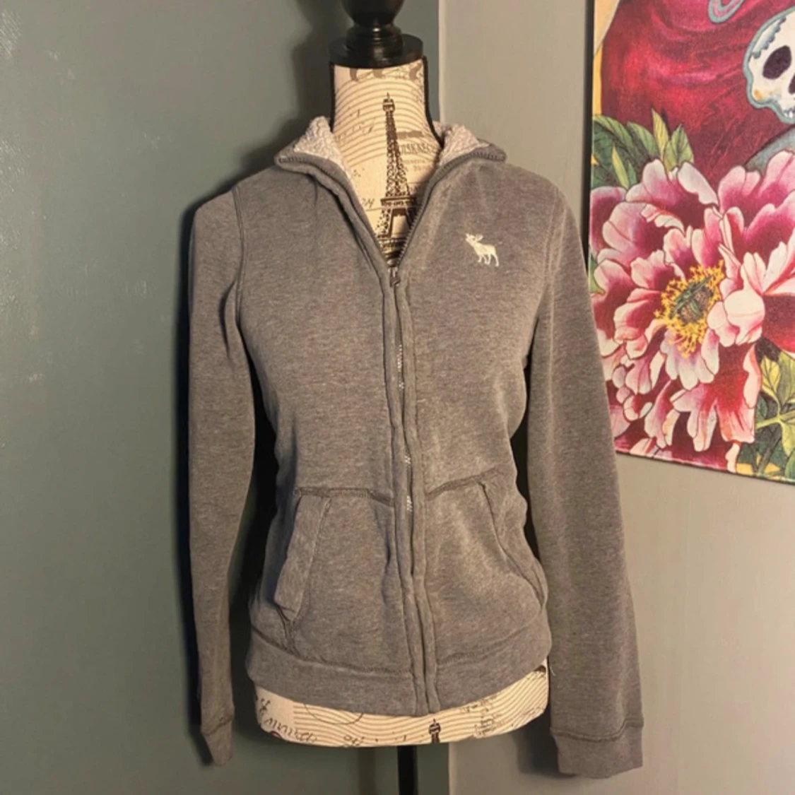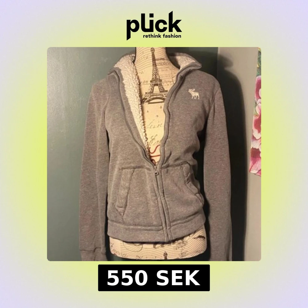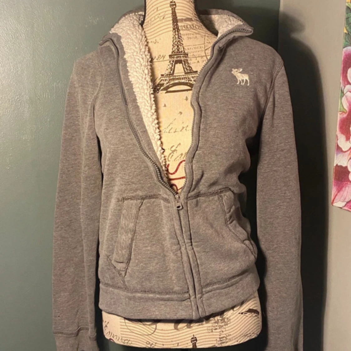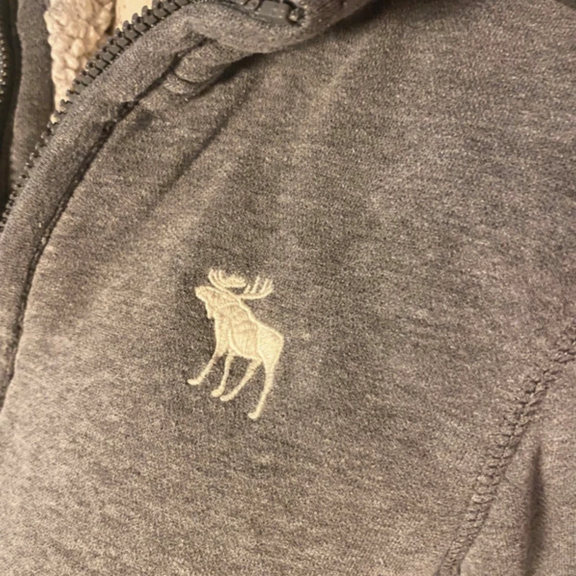 Mysig grå hoodie med dragkedja från Abercrombie & Fitch. Fodrad med vit teddy på insidan av kragen, broderad älg-logga på bröstet och två fickor framtill. Perfekt för kyliga dagar och har en klassisk, enkel look.