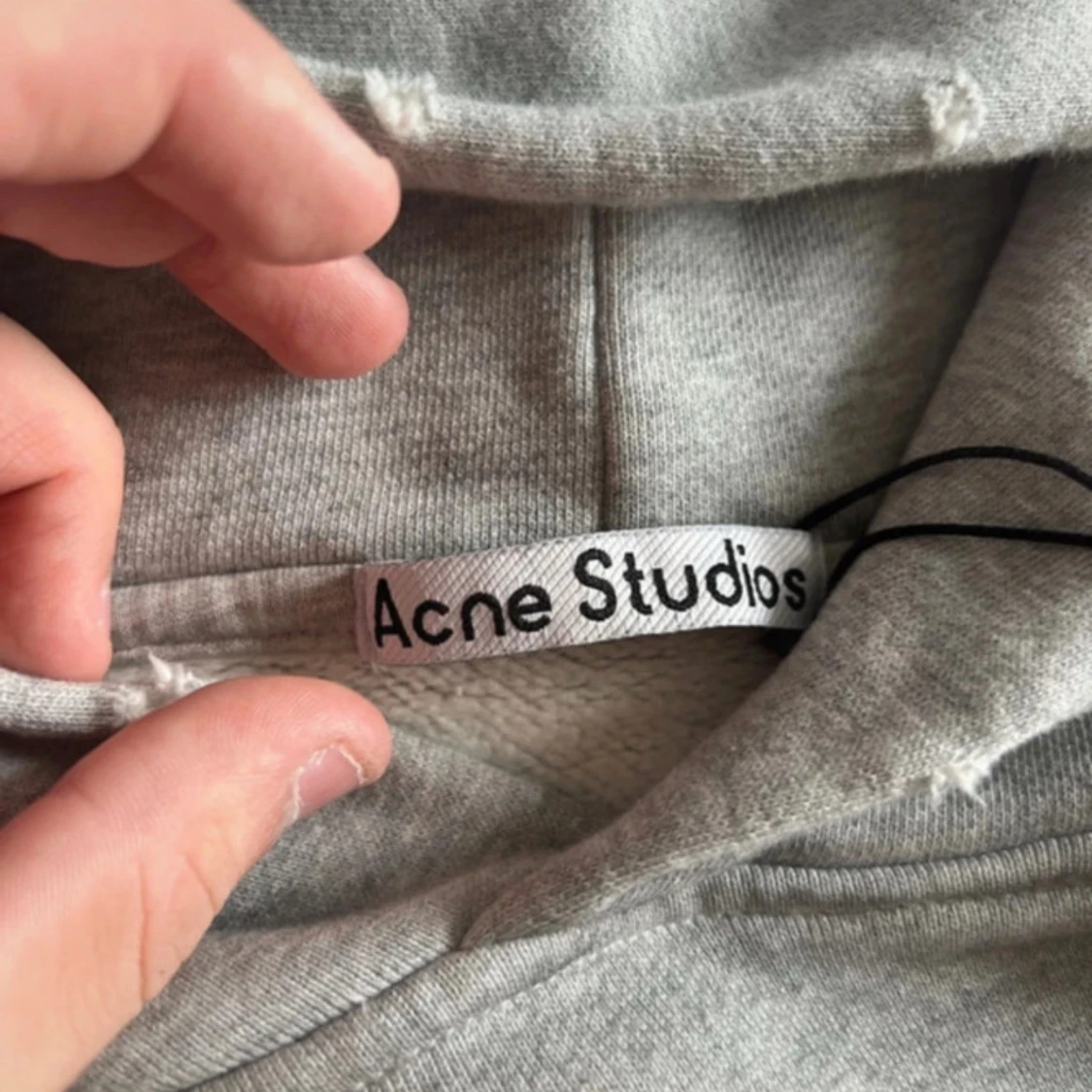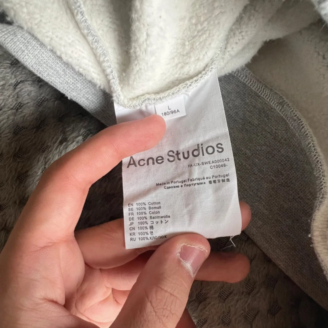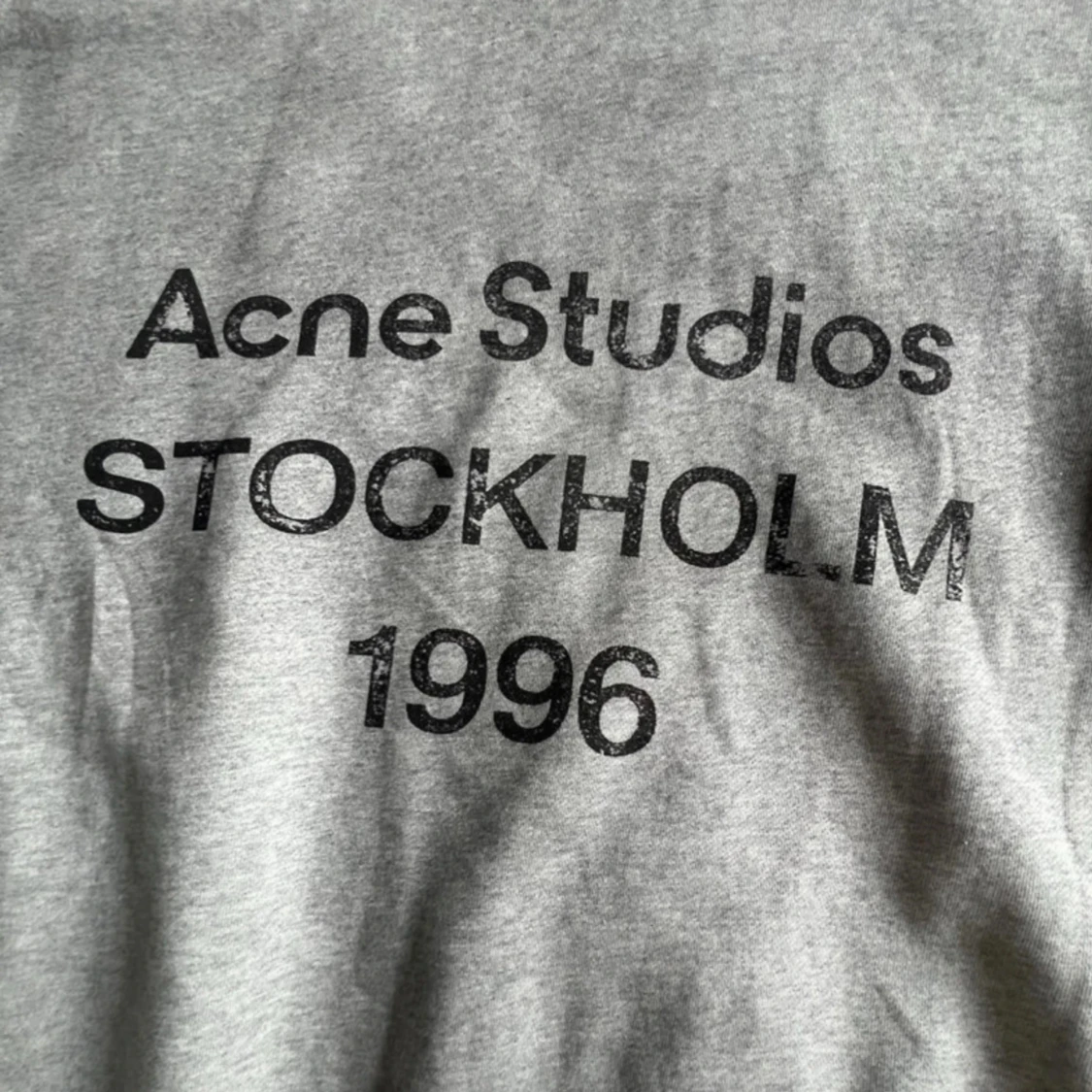 Säljer en clean grå hoodie från Acne Studios i storlek L. Tröjan har huva, långa ärmar och tryck med 'Acne Studios STOCKHOLM 1996' på ryggen. Tillverkad i 100% bomull för skön och mjuk känsla. Perfekt för chill dagar och streetwear vibes. Vid snabb affär kan priset ändras!