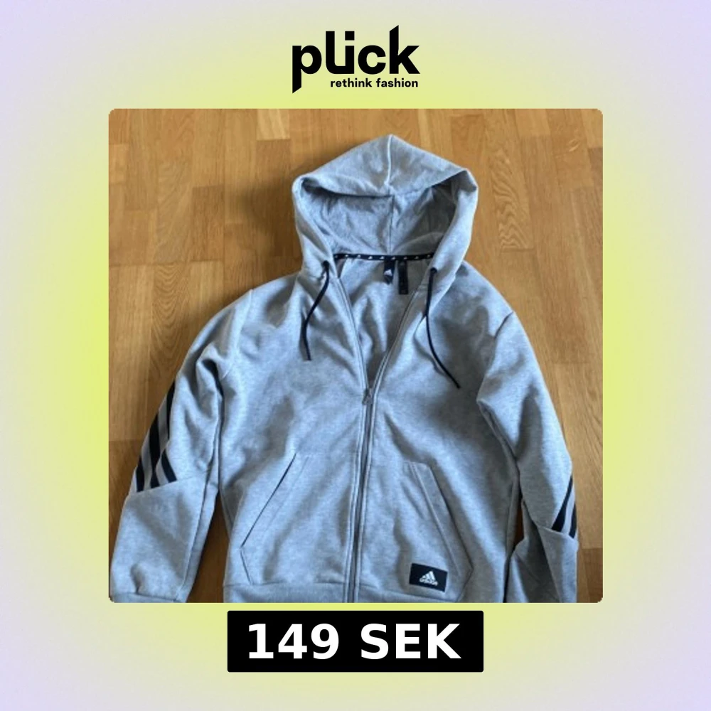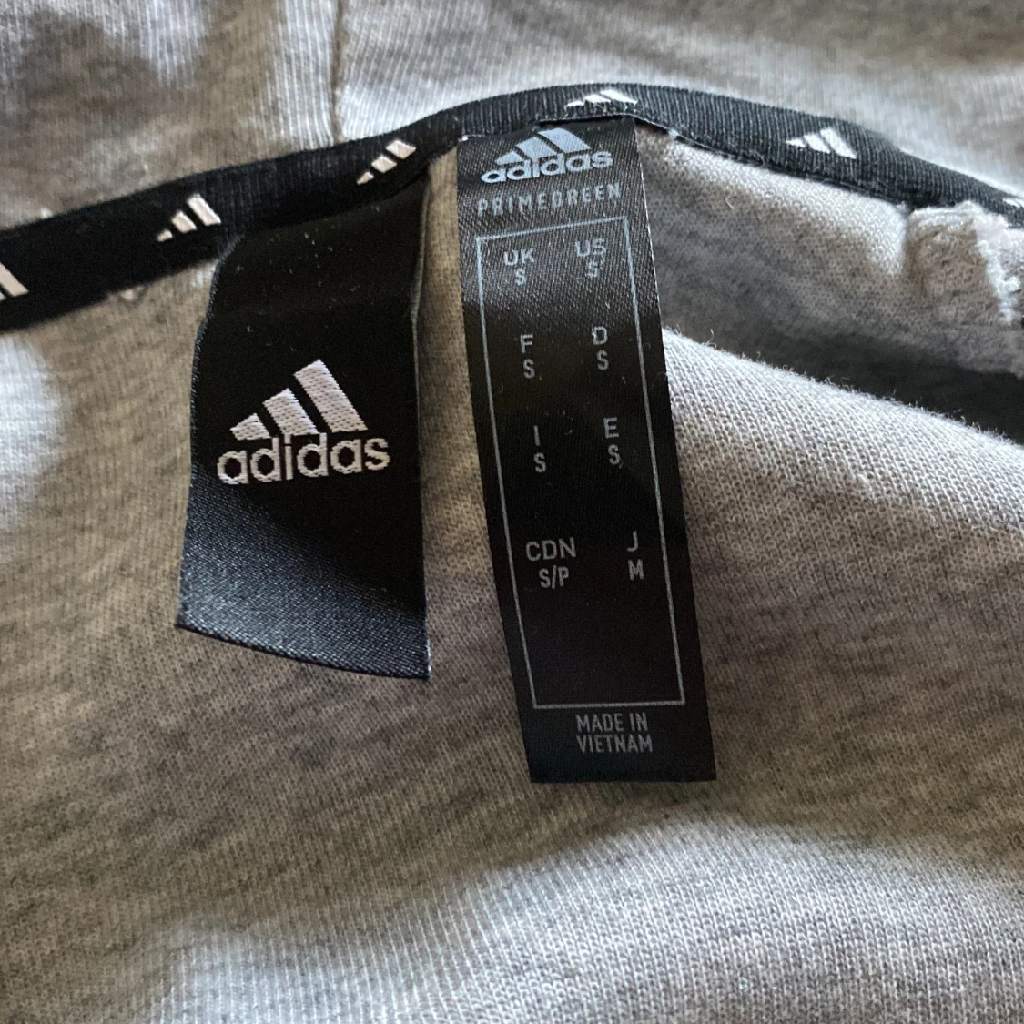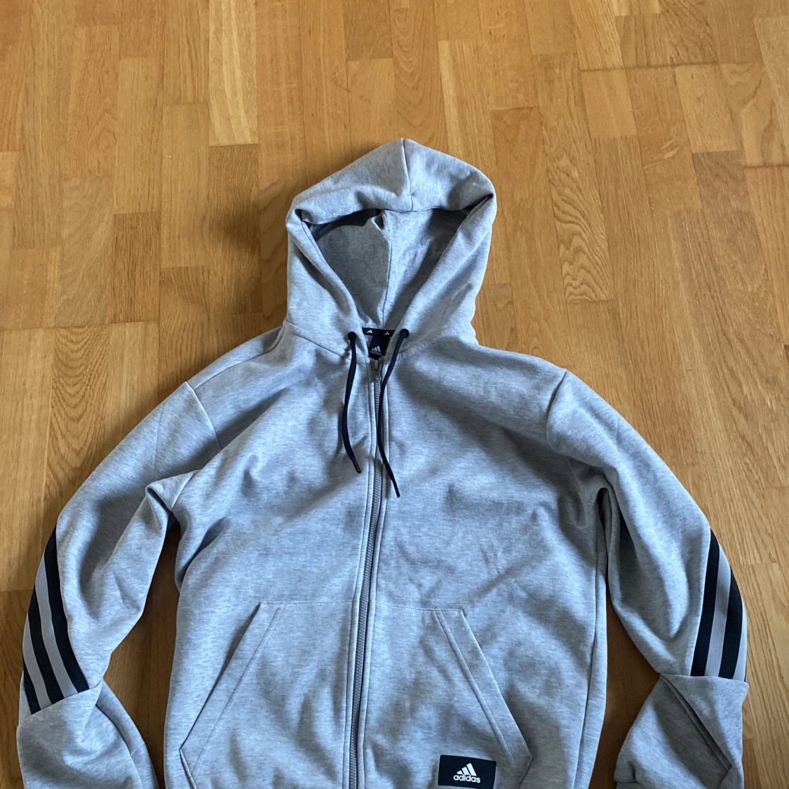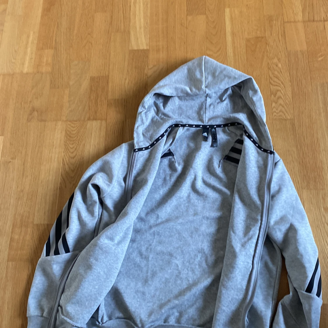 Säljer en grå hoodie från Adidas med dragkedja och huva. Tröjan har svarta ränder på ärmarna och två fickor framtill. Tillverkad i mjukt material och har Adidas-logga på ena fickan.