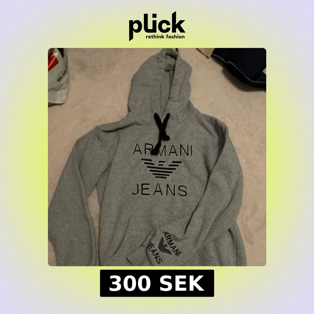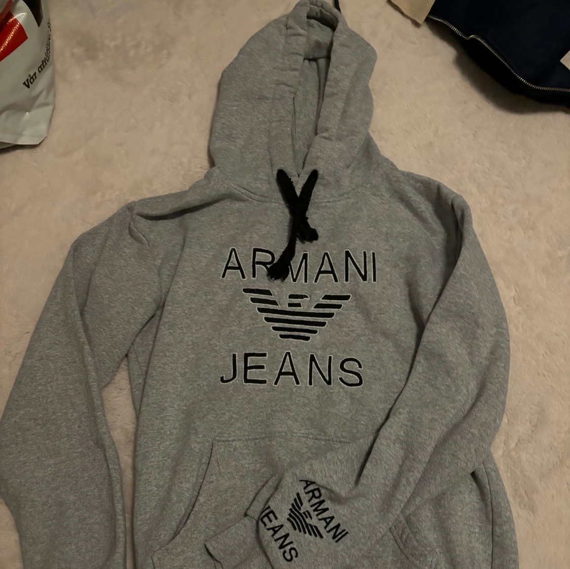 Snygg grå hoodie från Armani Jeans med svart logotyp på bröstet. Tröjan har en klassisk känguruficka och justerbar huva med svarta snören. Perfekt för en avslappnad stil. Passar både xs och s.