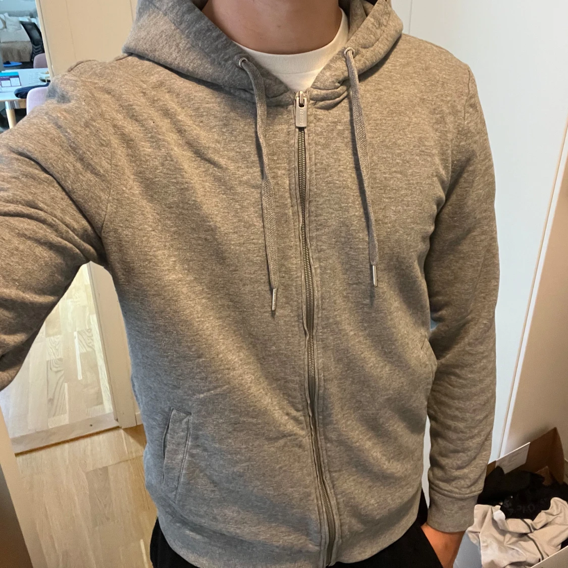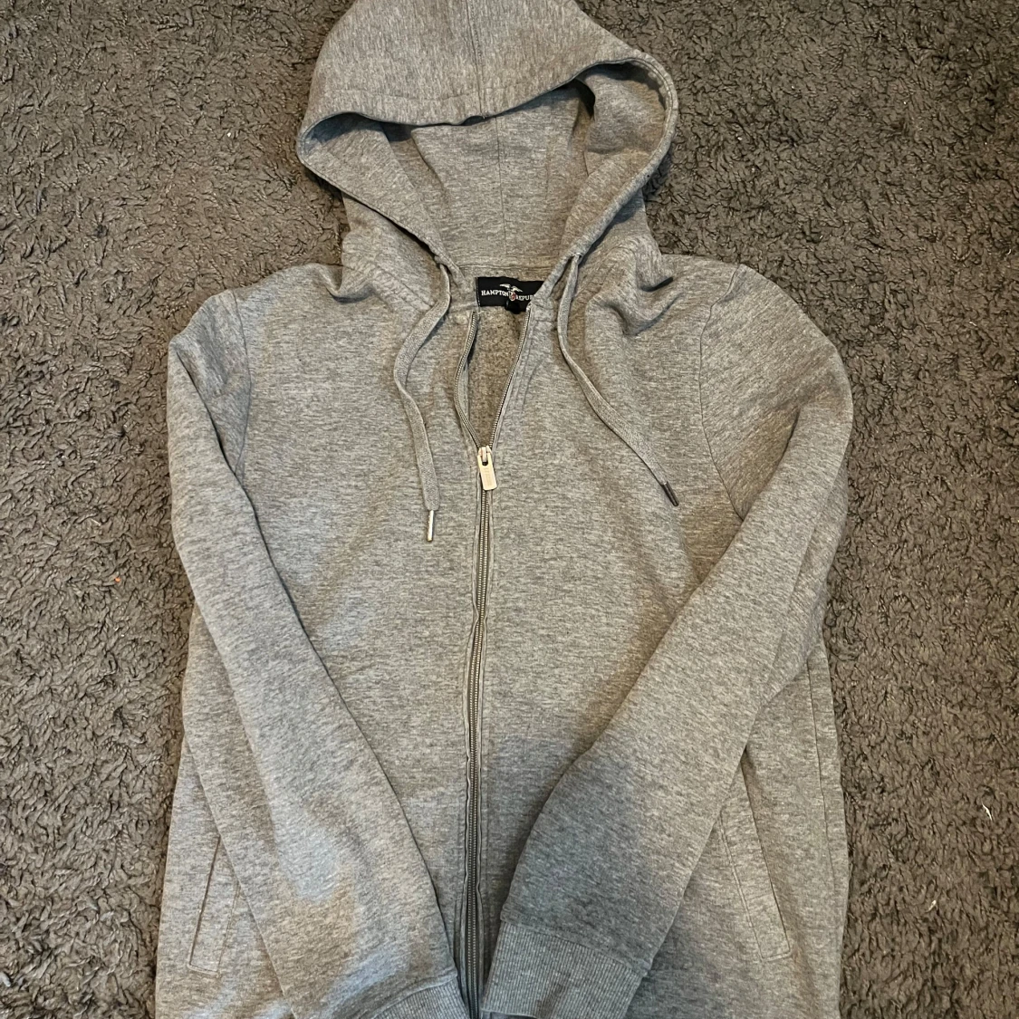 Säljer en grå hoodie från Band of Brothers med dragkedja och snörning i huvan. Tröjan har ribbade muddar, två fickor fram och är tillverkad i mjuk bomullsmix. Perfekt för chill dagar eller när du vill ha något bekvämt och stilrent.