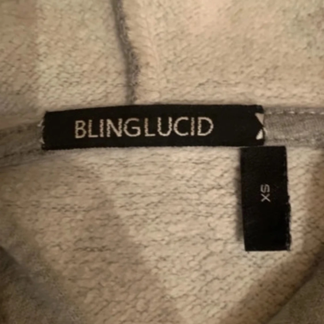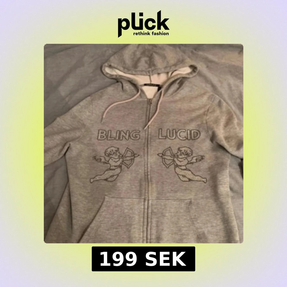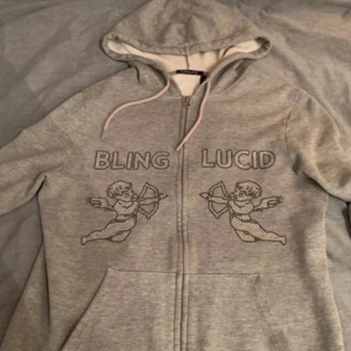 Säljer en grå hoodie från Bling Lucid med dragkedja och huva. Tröjan har tryck av två änglar med pilbågar och texten 'BLING LUCID' på framsidan. Perfekt för en avslappnad stil.