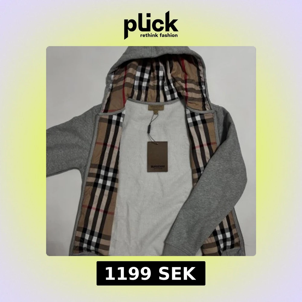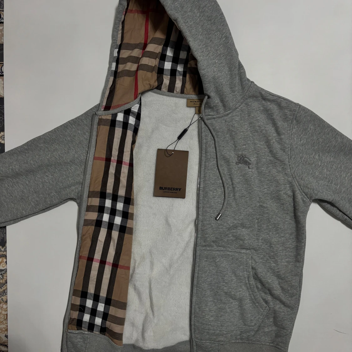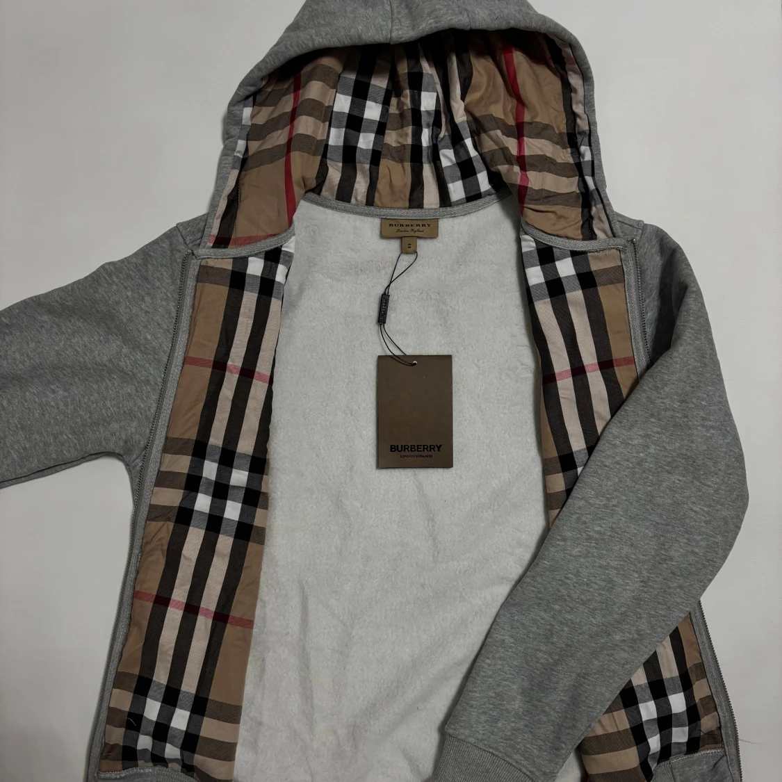 Snygg grå hoodie från Burberry med klassiskt rutigt foder i beige, svart och rött. Tröjan har huva med snörning, silverfärgad dragkedja och broderad Burberry-logga på bröstet. Perfekt för dig som gillar stilrena detaljer och exklusiva märken. Skickas imon 24 timmar!