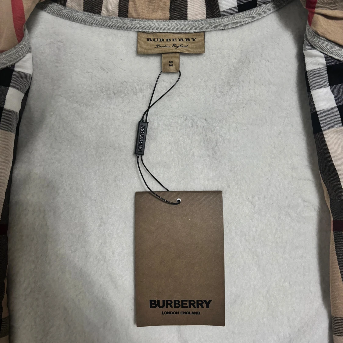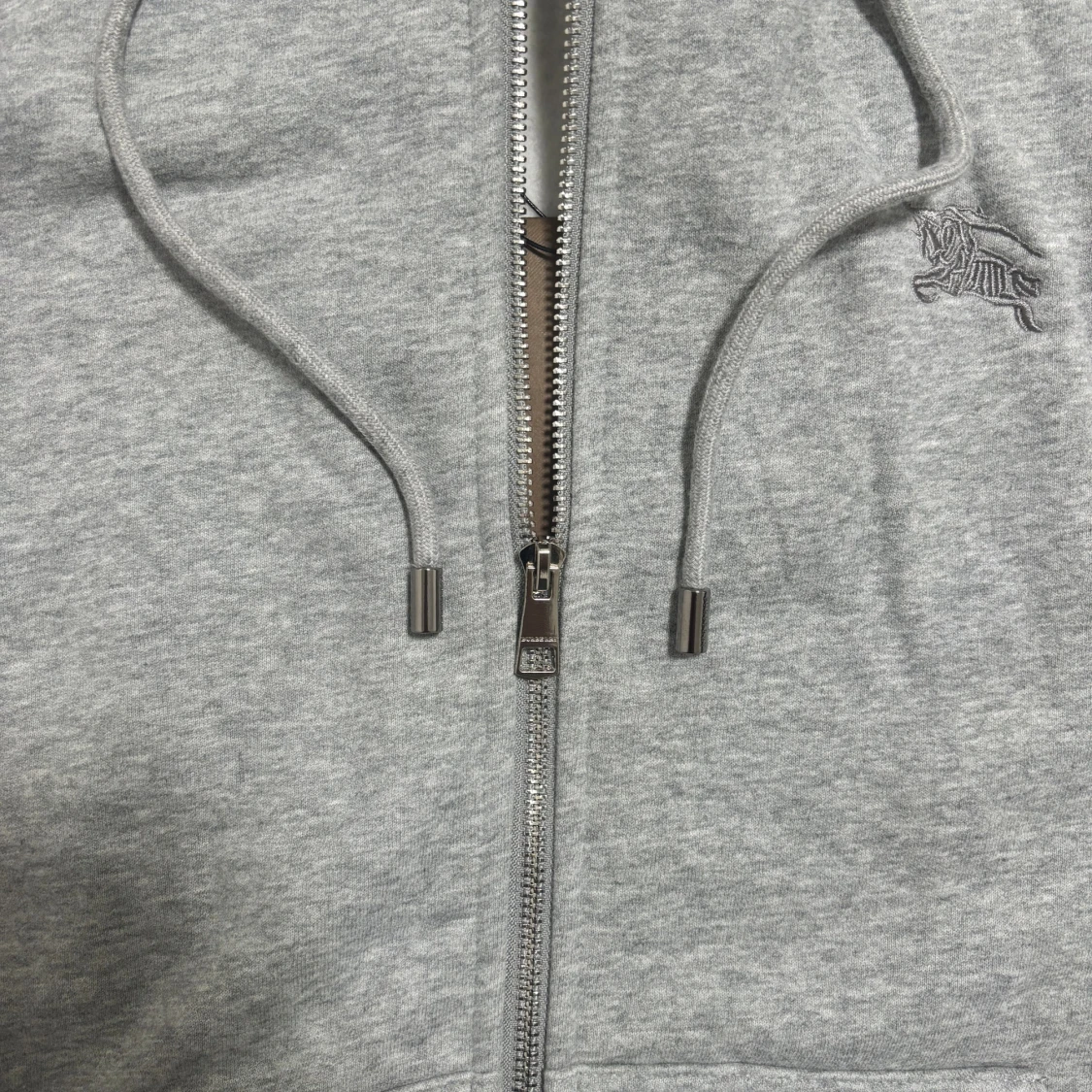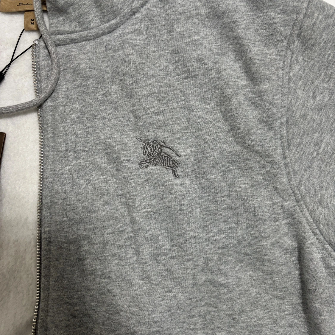 Snygg grå hoodie från Burberry med klassiskt rutigt foder i beige, svart och rött. Tröjan har huva med snörning, silverfärgad dragkedja och broderad Burberry-logga på bröstet. Perfekt för dig som gillar stilrena detaljer och exklusiva märken. Skickas imon 24 timmar!