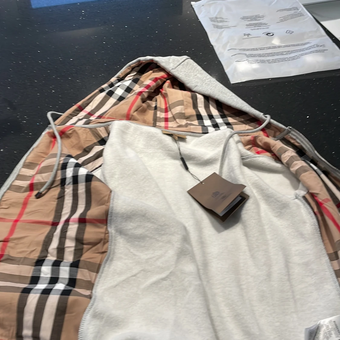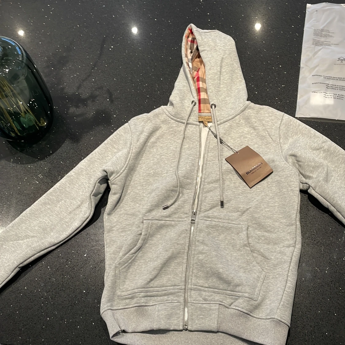 Säljer en snygg grå hoodie från Burberry i mycket bra skick. Den har en klassisk dragkedja och en huva med det ikoniska Burberry-mönstret på insidan. Perfekt för både vardag och lite finare tillfällen. Tillverkad i Italien med högkvalitativt bomullsmaterial. Passar perfekt för höst och vår!