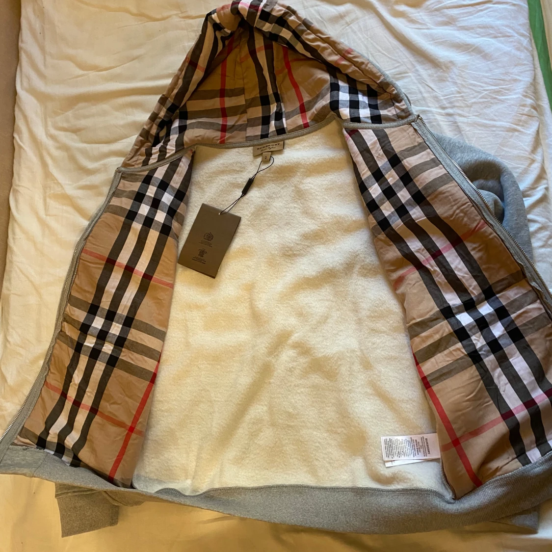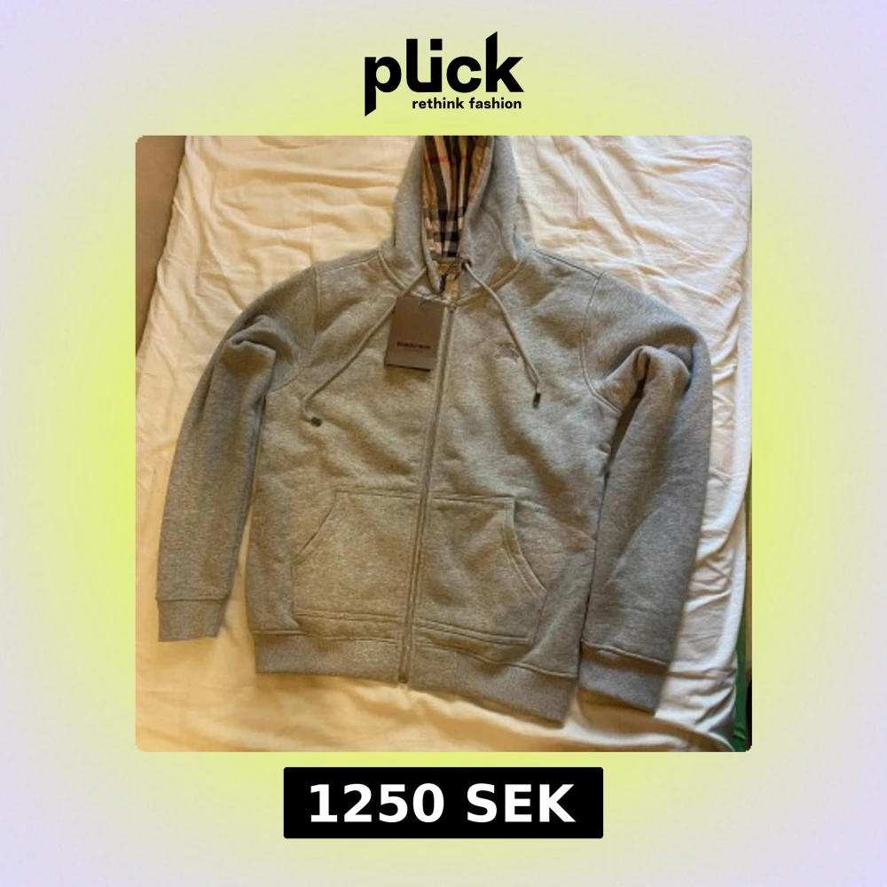 Säljer en stilren grå hoodie från Burberry med klassiskt rutigt mönster i huvan. Tröjan har dragkedja framtill och praktiska fickor. Perfekt för en avslappnad och trendig look.