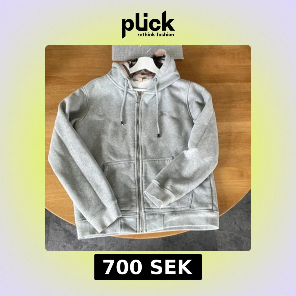 Säljer en stilren grå hoodie från Burberry med dragkedja och broderad logga på bröstet. Insidan av huvan har det klassiska Burberry-rutiga mönstret. Perfekt för en avslappnad och trendig look.