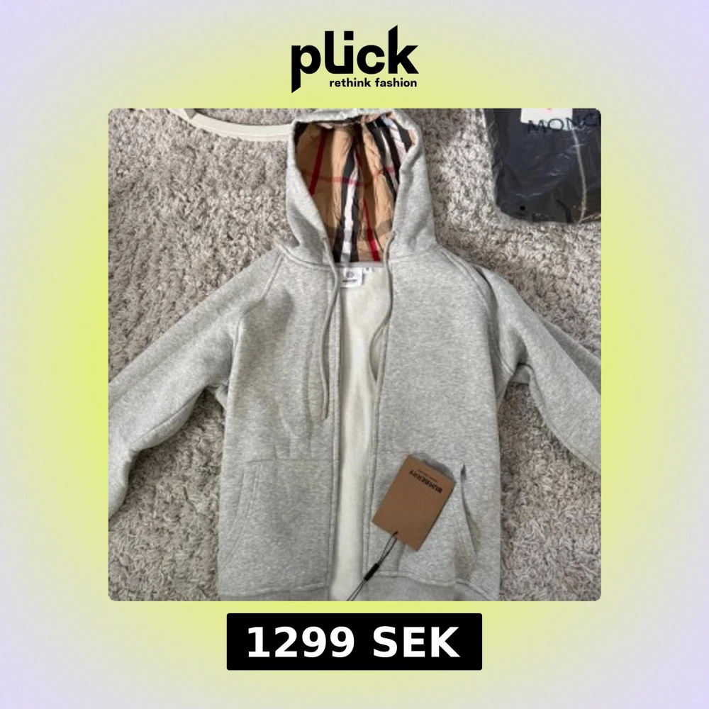 Snygg grå hoodie från Burberry med klassiskt rutigt foder i huvan. Tröjan har dragkedja framtill, snörning i huvan och två fickor. Tillverkad i mjuk bomull, perfekt för chill dagar. Stilsäker detalj med Burberry-tag kvar.
