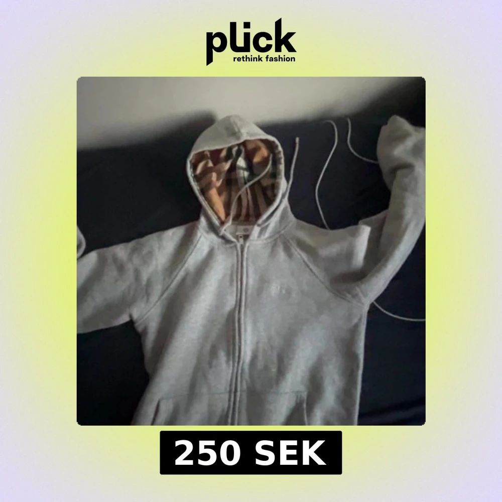 Säljer en grå hoodie från Burberry med klassiskt rutigt foder i huvan. Tröjan har dragkedja framtill, snören vid huvan och broderad logga på bröstet. Perfekt för dig som gillar stilrena och lyxiga streetwear-plagg.