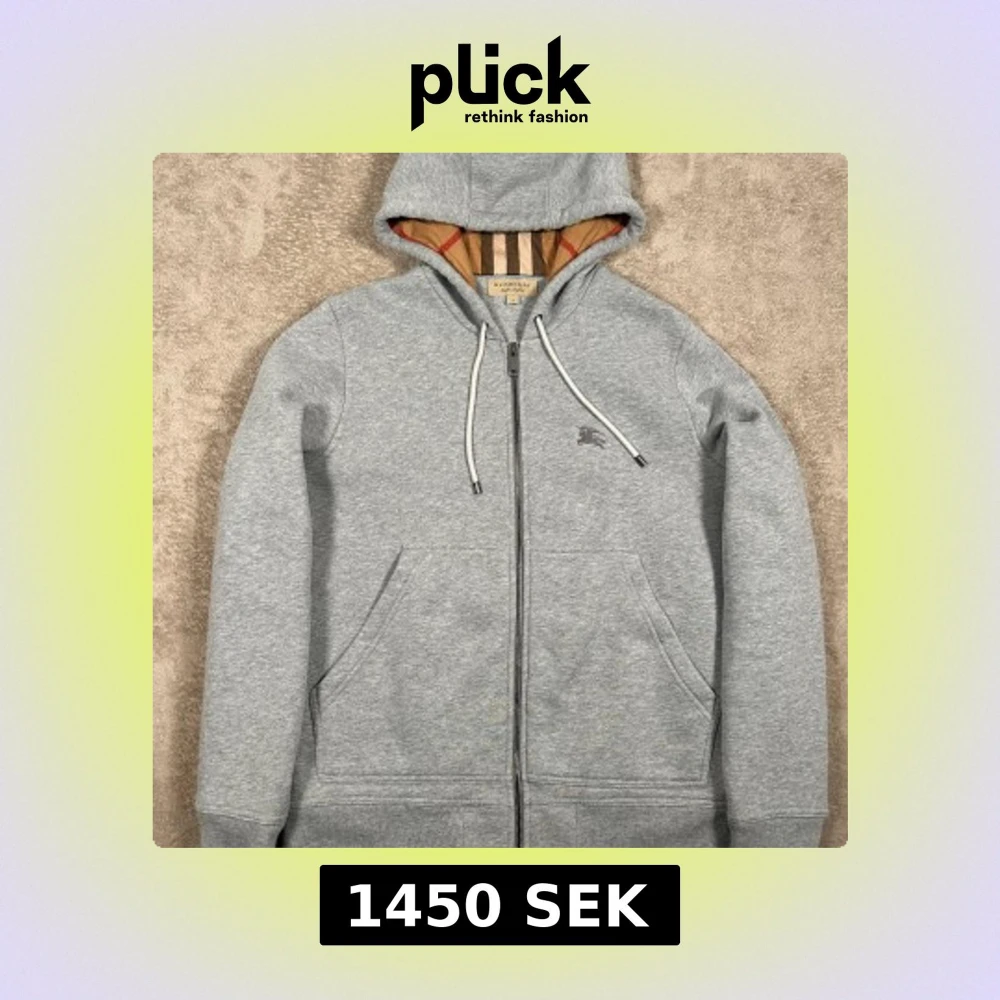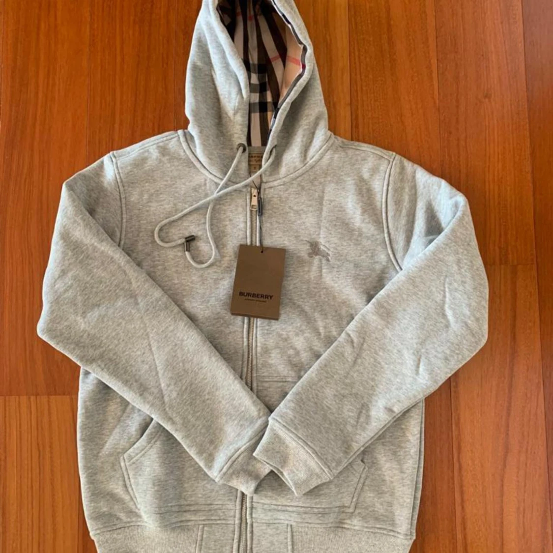 Snygg grå hoodie från Burberry med klassiskt rutigt foder i huvan och dragkedja framtill. Tröjan har snörning i huvan, två fickor och diskret Burberry-logga på bröstet. Perfekt för en chill och stilren look.