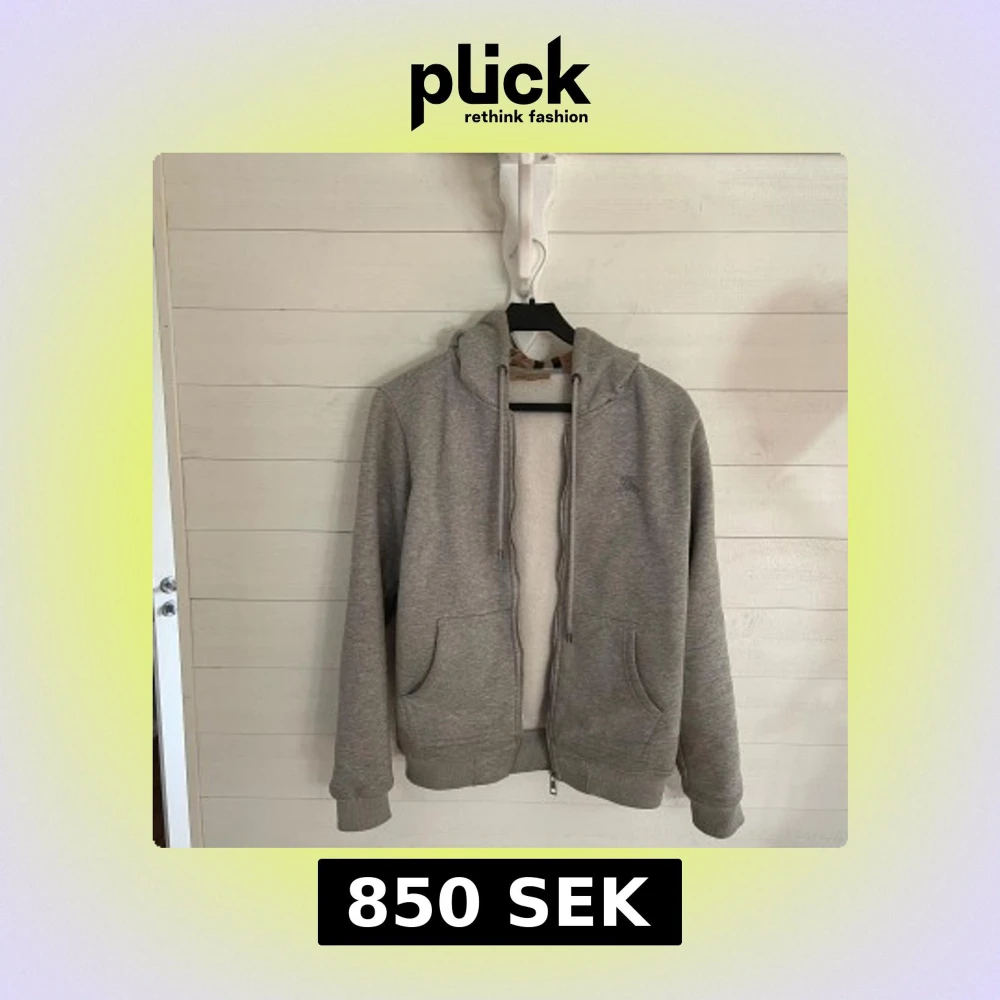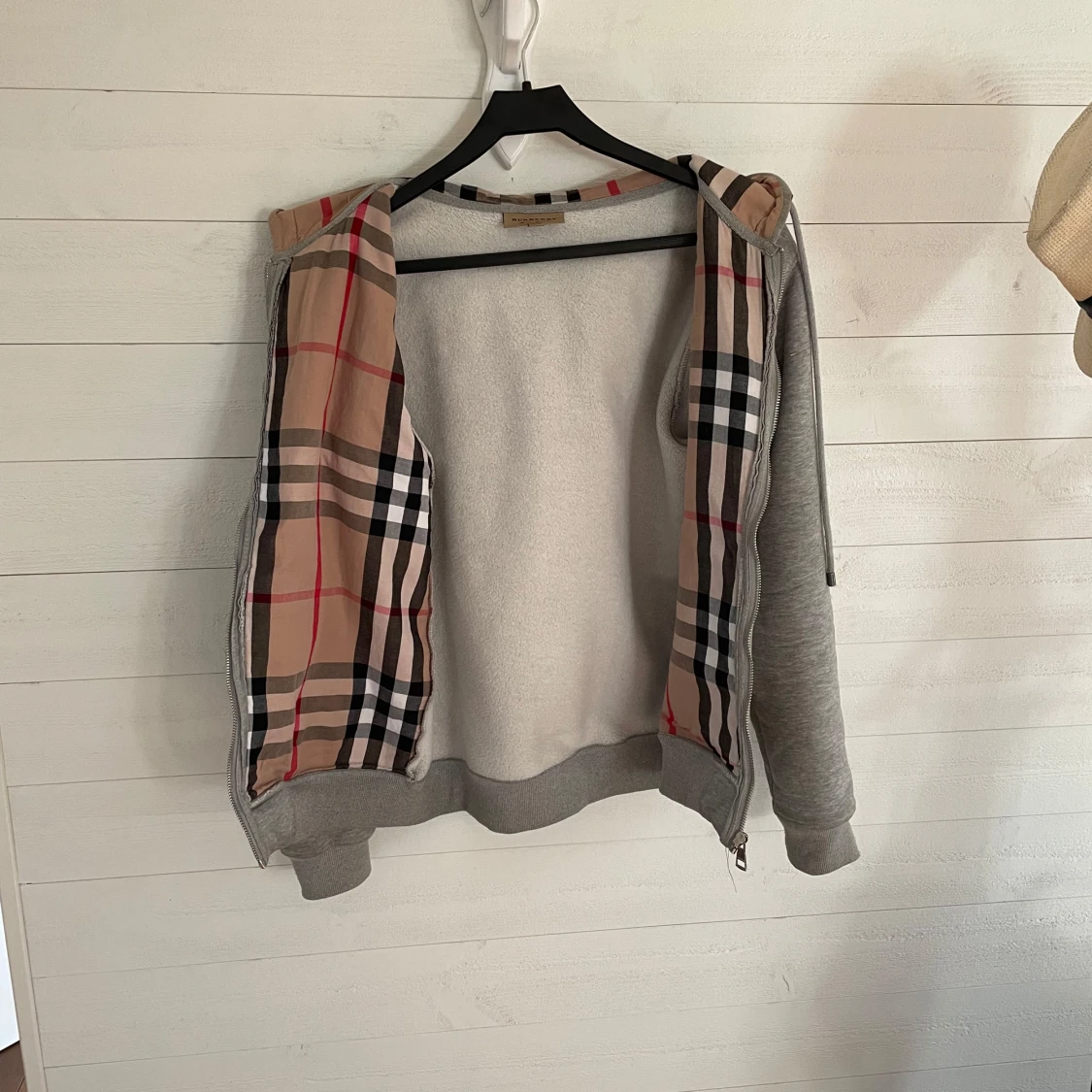Säljer en grå hoodie från Burberry med dragkedja och huva. Insidan har det ikoniska Burberry-rutiga fodret i beige, svart och rött. Två fickor framtill och ribbade muddar vid ärmslut och nederkant.