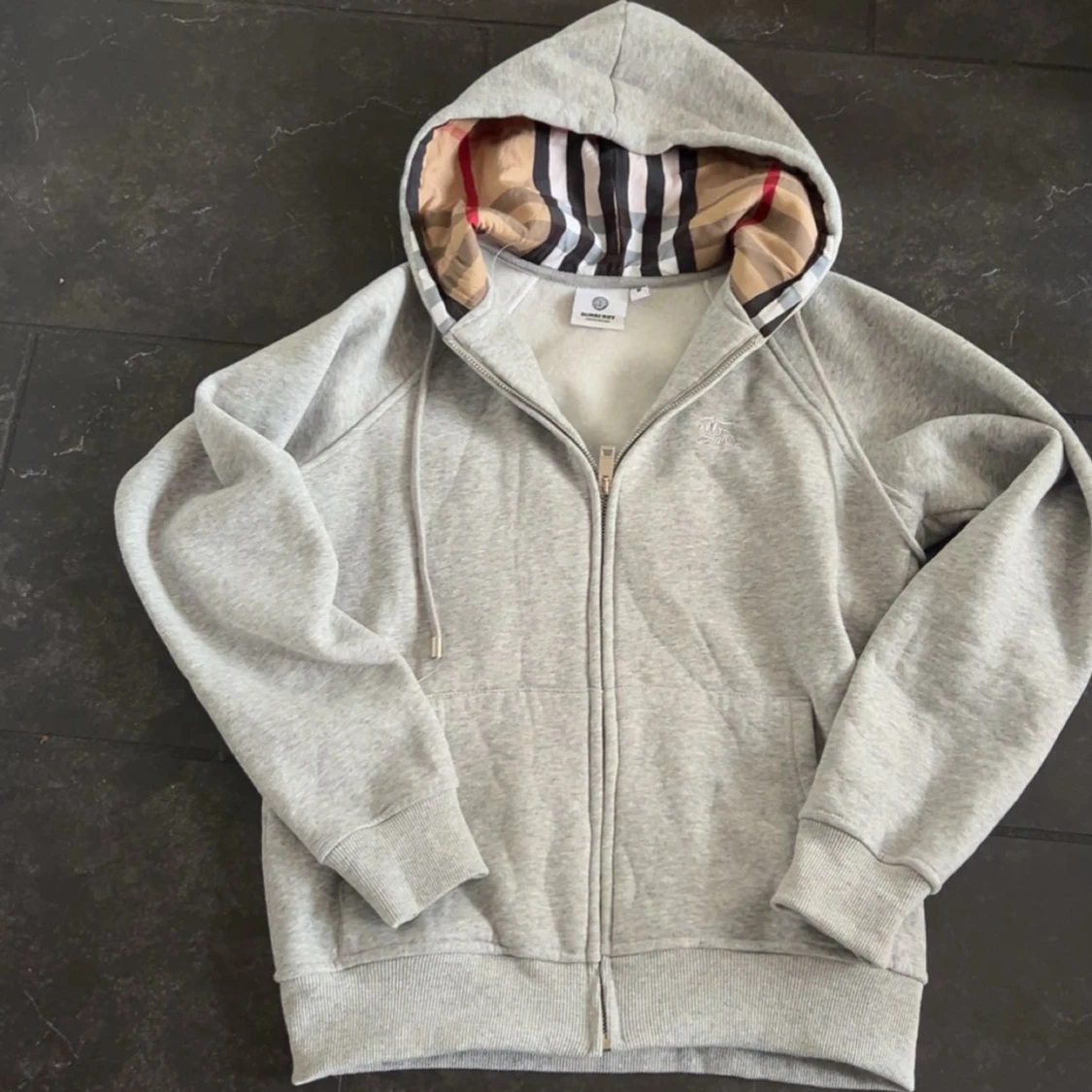 Snygg grå hoodie från Burberry med klassisk rutmönstrad huva och broderad logga på bröstet. Helt ny burrberry hoodie (äkta) inte för ett jättebra pris HELT NY