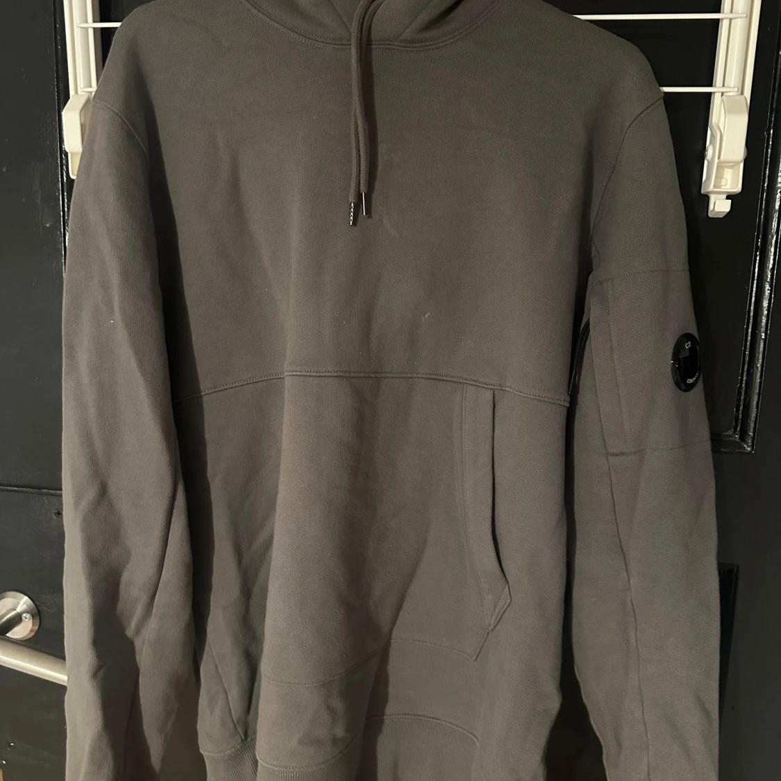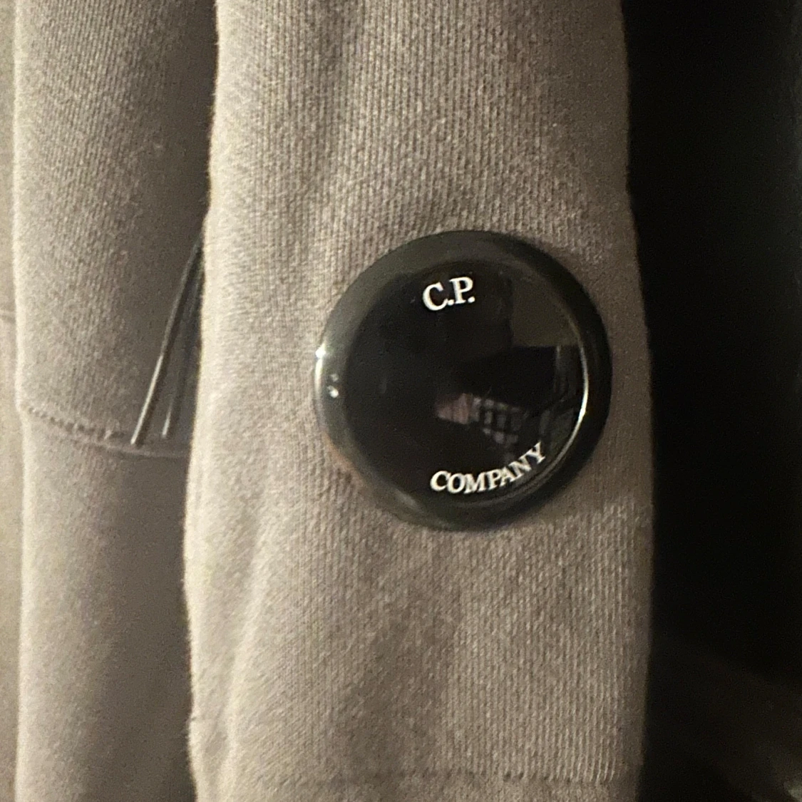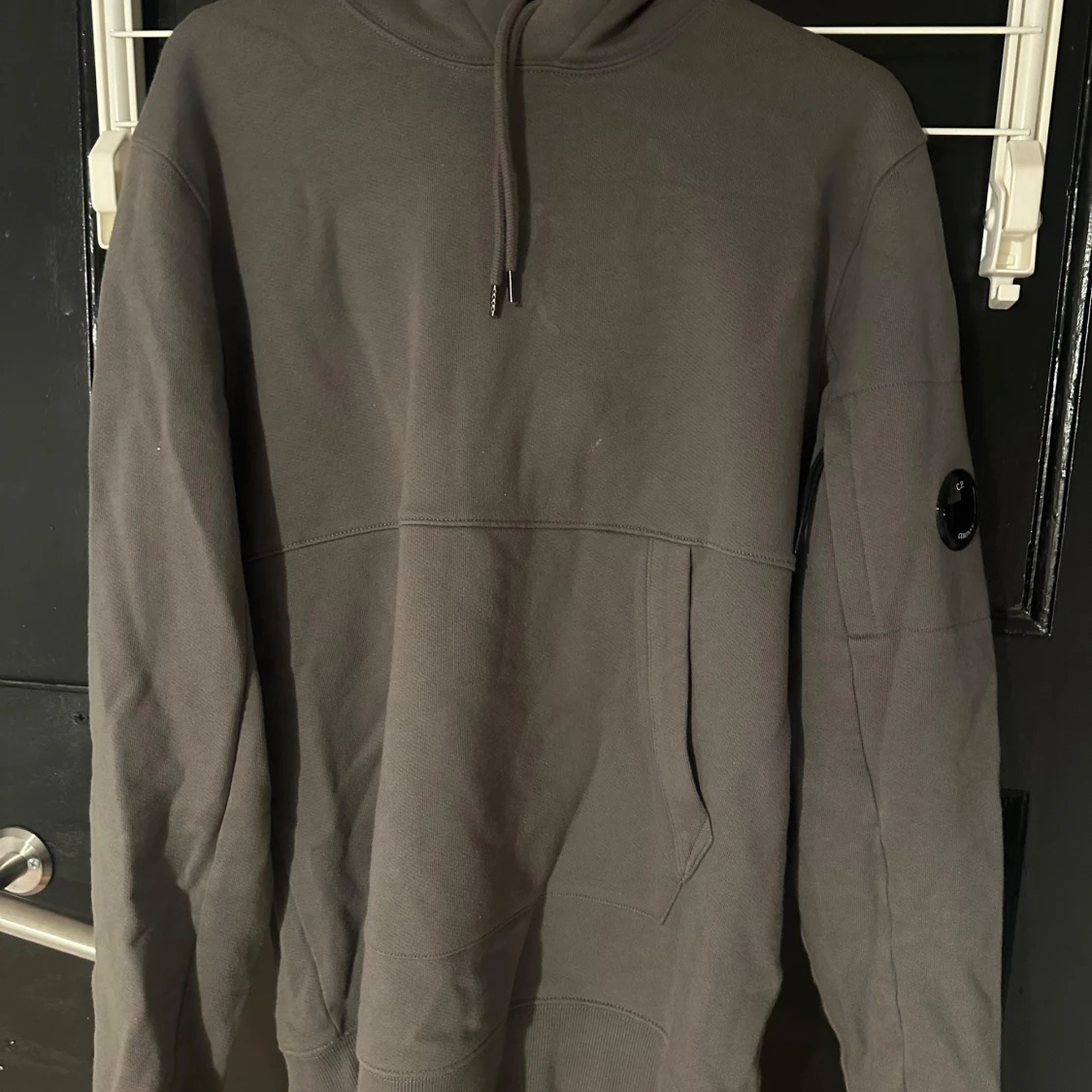 Säljer en stilren grå hoodie från C.P. Company. Tröjan har en klassisk design med en justerbar huva och en ficka framtill. Märkets logotyp finns på ärmen som en snygg detalj.