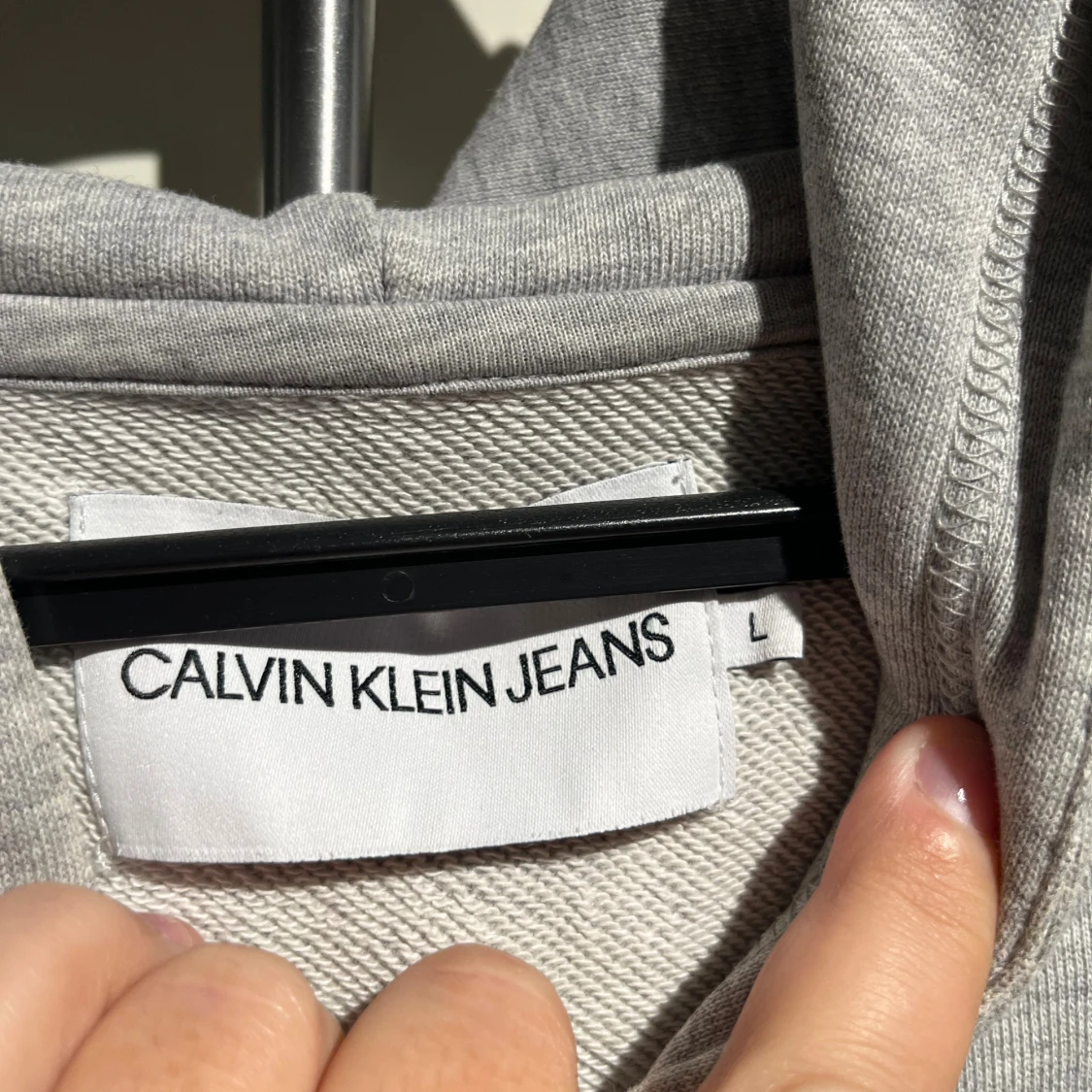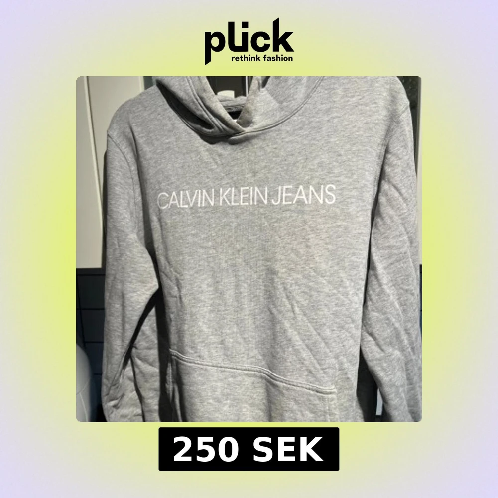 Säljer en stilren grå hoodie från Calvin Klein Jeans med vit logga framtill. Tröjan har huva, magficka och långa ärmar. Perfekt för en chill och avslappnad look.