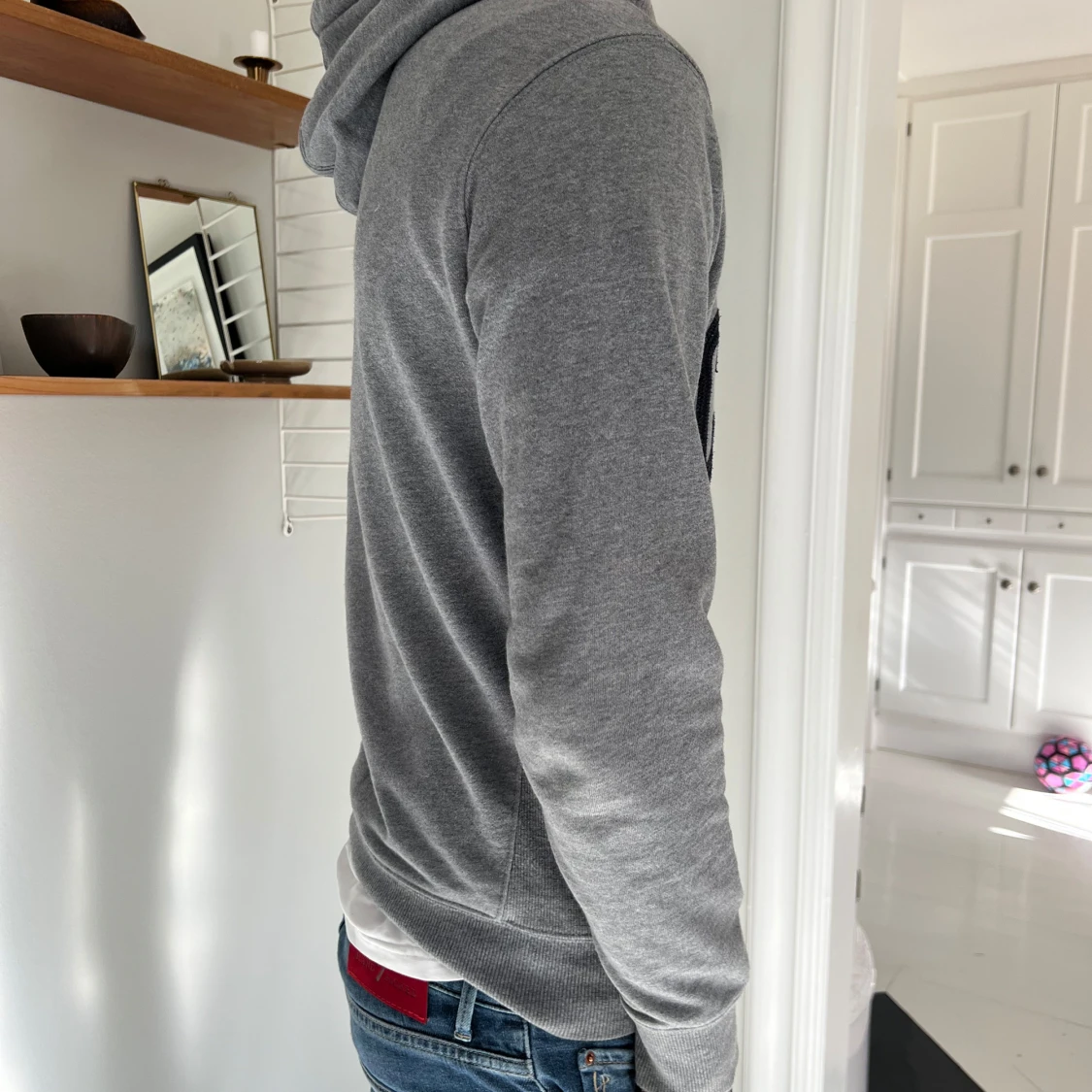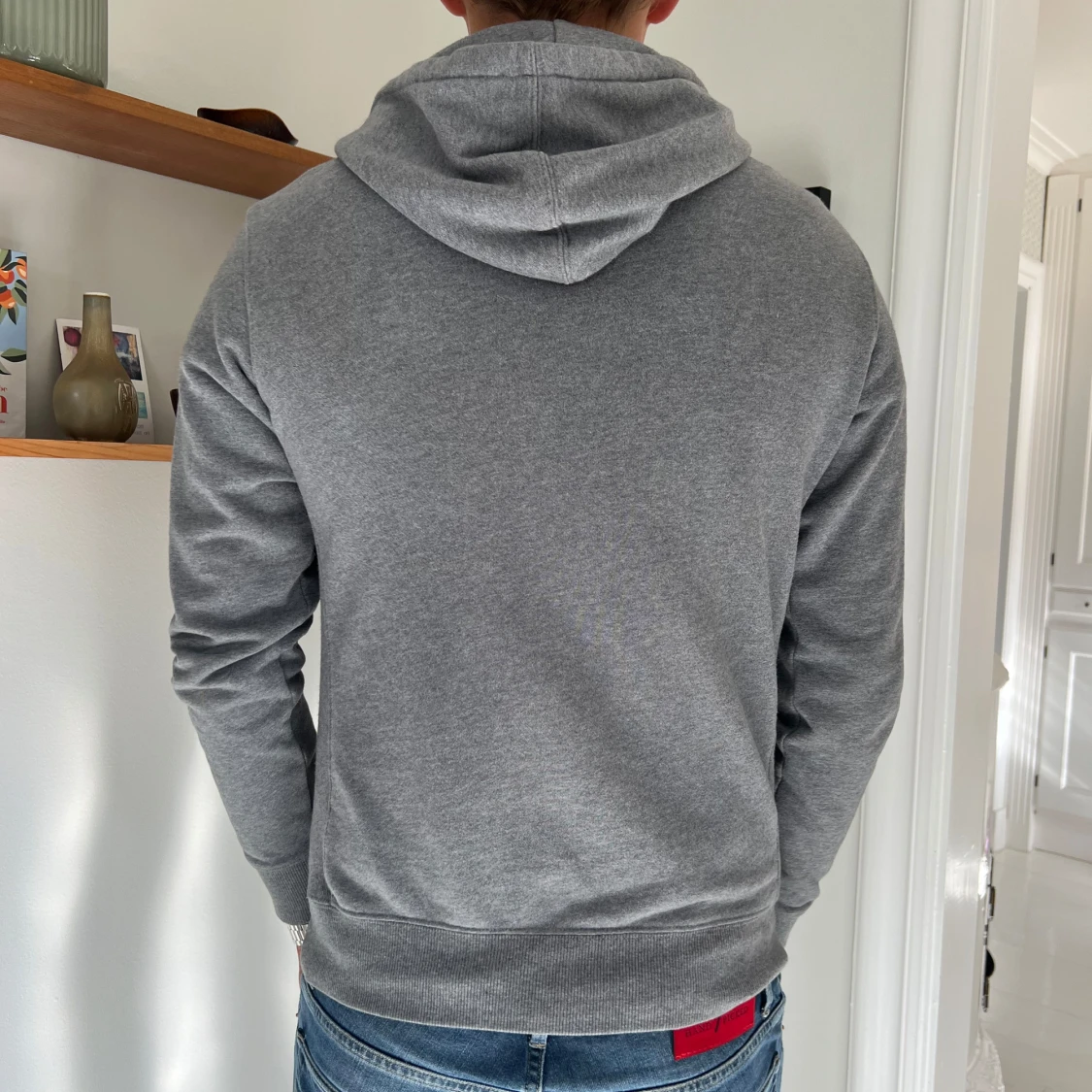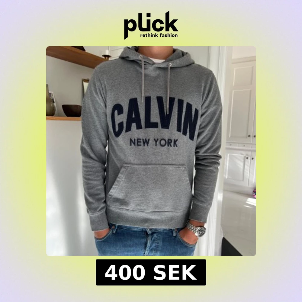 Snygg grå hoodie från Calvin Klein med stor svart text 'CALVIN NEW YORK' på bröstet. Tröjan har huva med snörning, magficka och långa ärmar. Mjuk bomullskvalitet och normal passform.