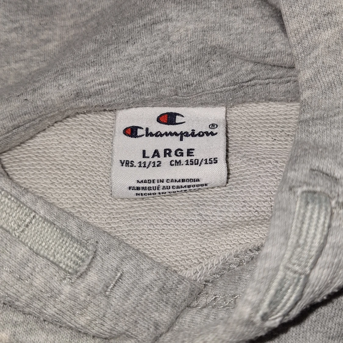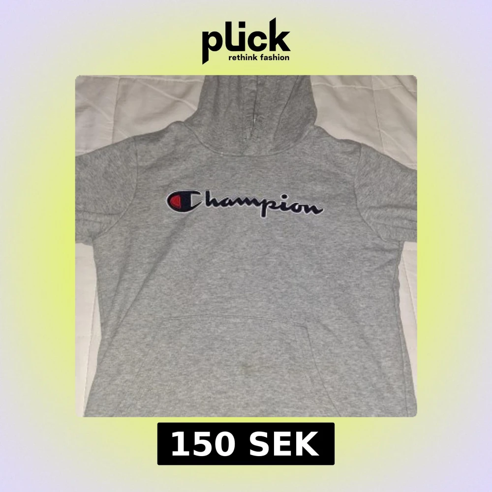 Säljer en grå hoodie från Champion med stor broderad logga på bröstet. Tröjan har korta ärmar, huva och en klassisk känguruficka framtill. Perfekt för chill dagar eller när du vill ha en sportig look.