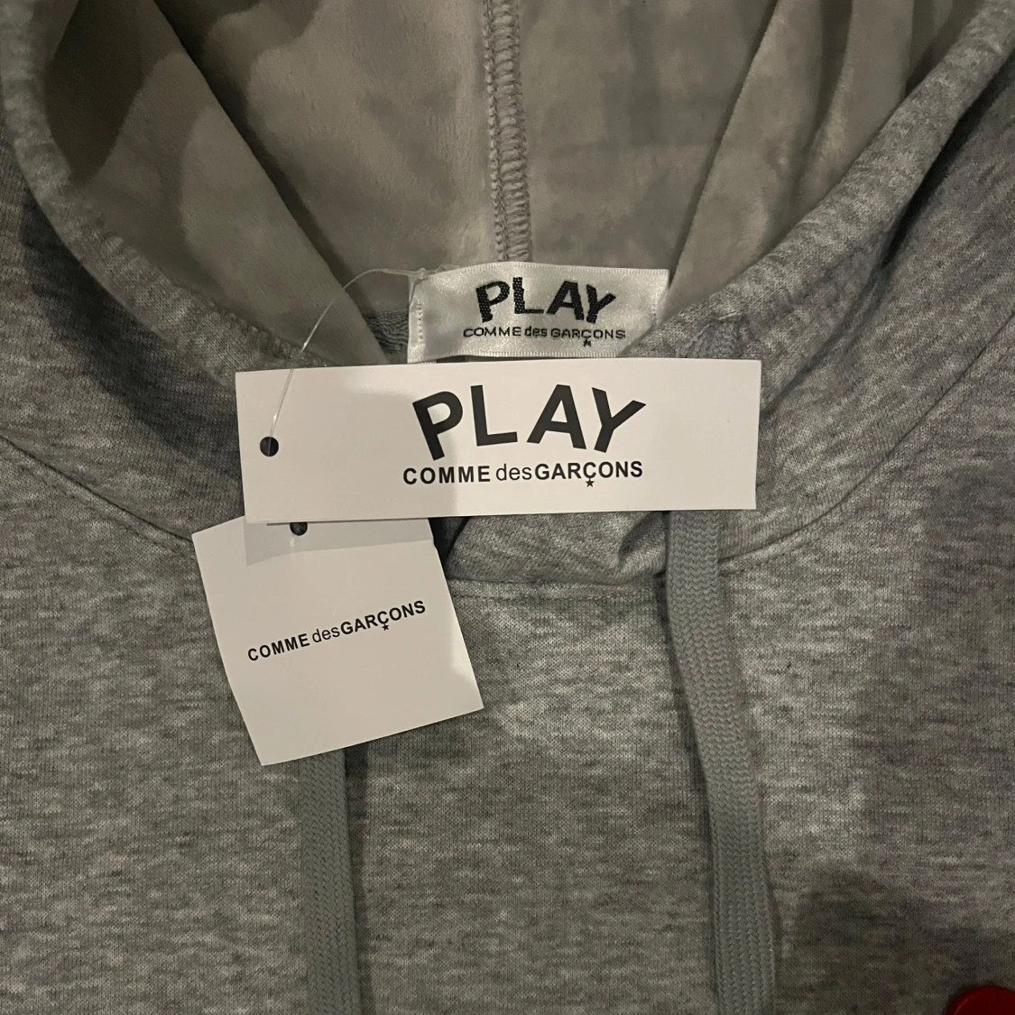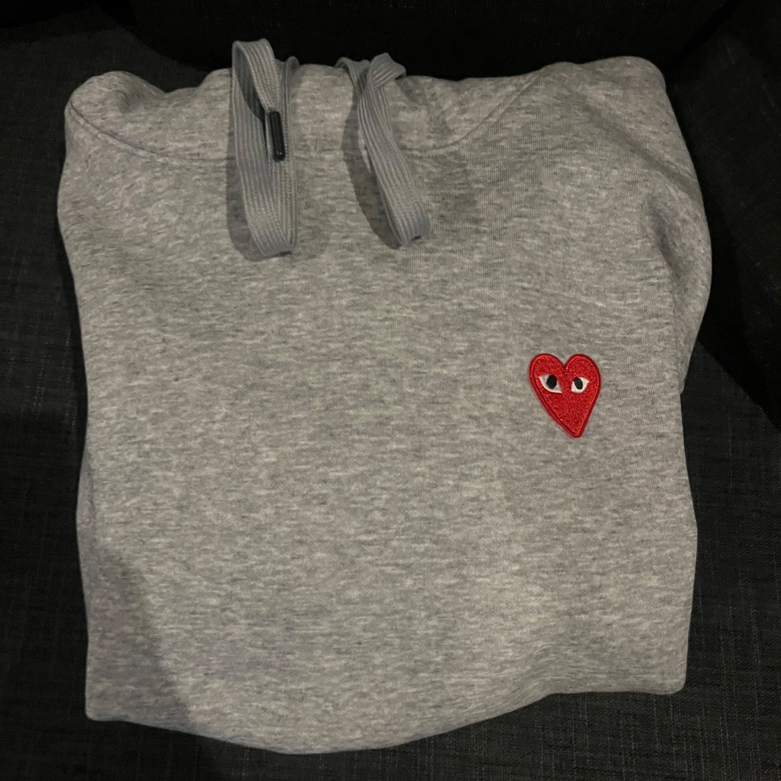 Säljer en stilren grå hoodie från Comme des Garçons med det ikoniska röda hjärtat på bröstet. Tröjan har en justerbar huva med dragsko och en praktisk magficka. Perfekt för en avslappnad look.