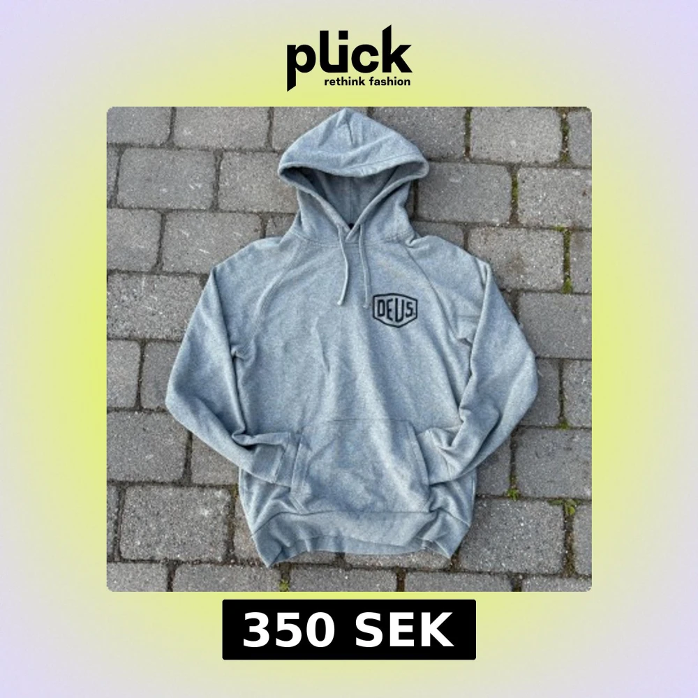 Säljer en grå hoodie från Deus Ex Machina med svart logga på bröstet och stor text på ryggen. Tröjan har huva, magficka och ribbade muddar. Perfekt för en avslappnad stil.