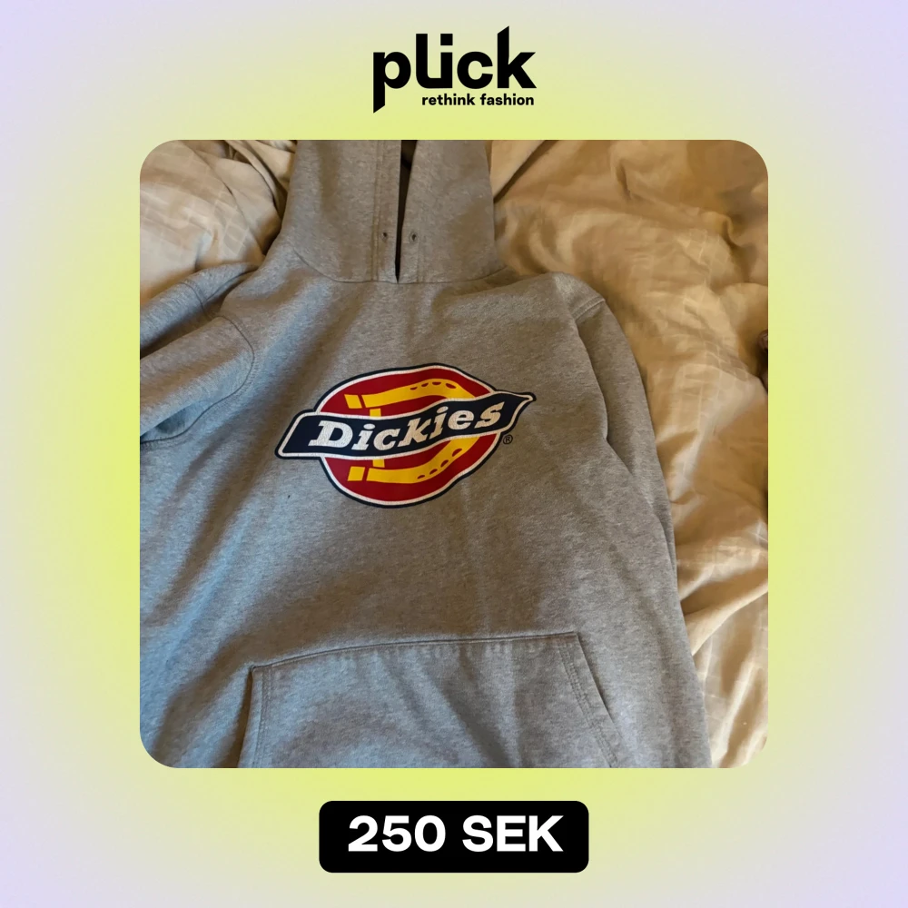 Säljer en klassisk grå hoodie från Dickies med original loggan. Inga difekter utom att snöret är borta. Strl s men skulle säga att den är M