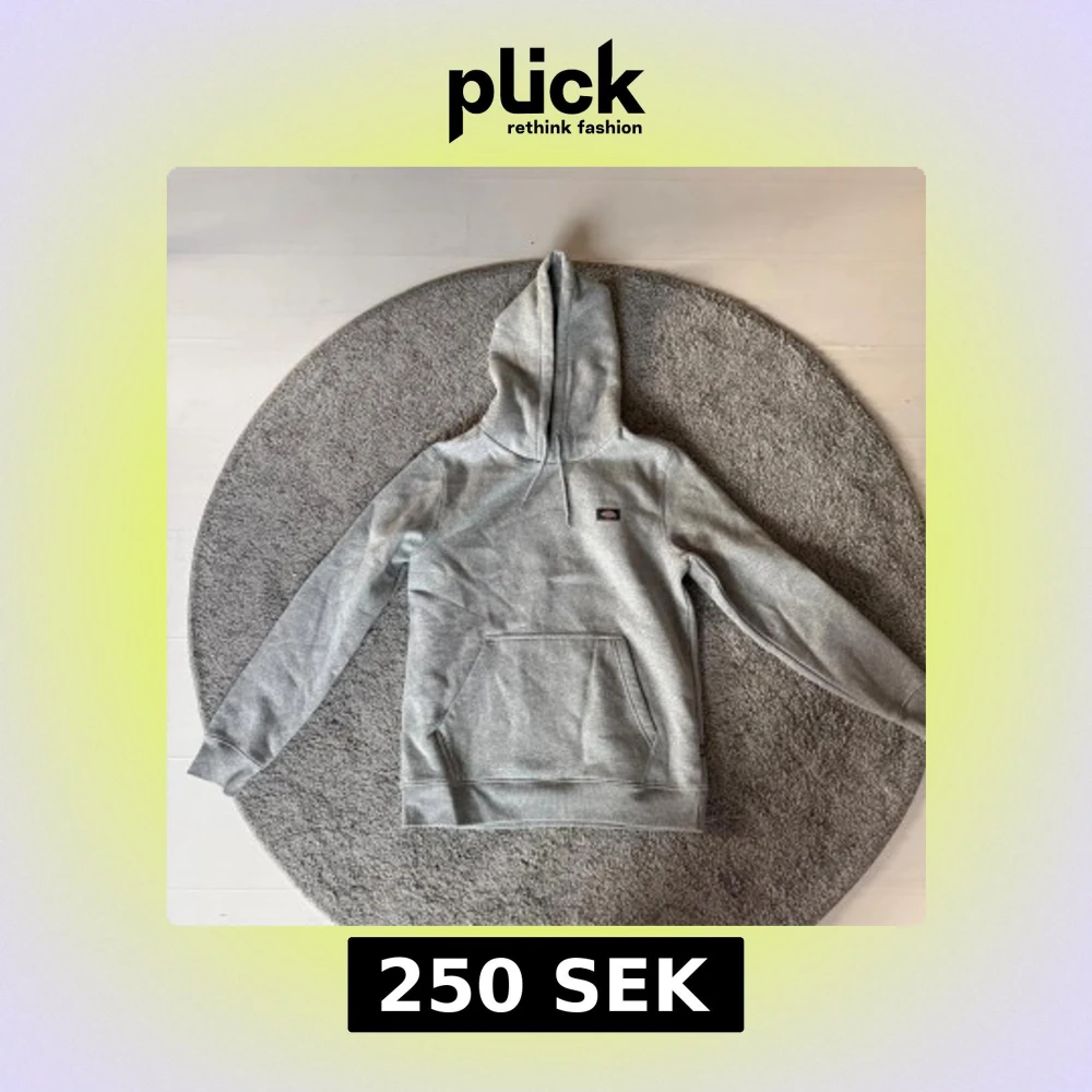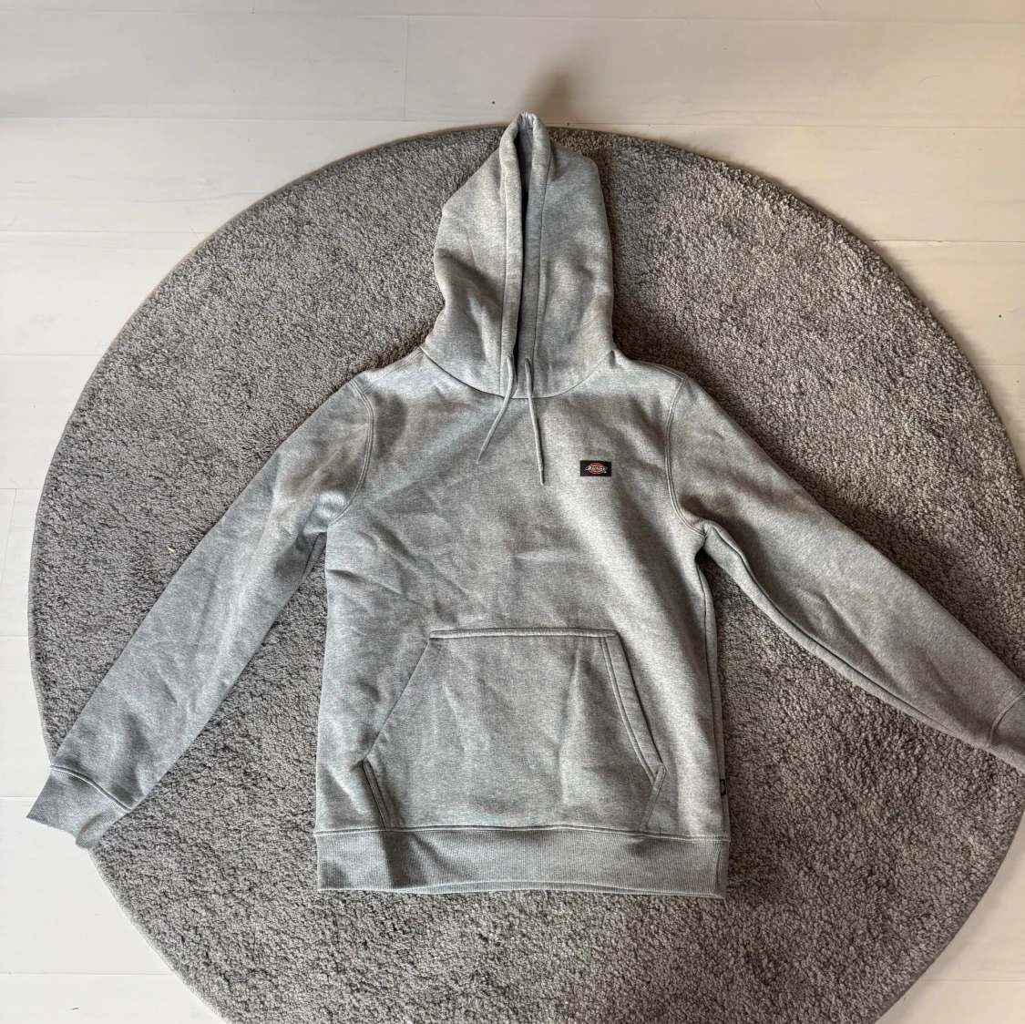 Säljer en grå hoodie från Dickies med klassisk huva och snörning. Tröjan har en stor magficka och ribbade muddar vid ärmslut och nederkant. Perfekt för chill dagar och streetwear-stil.