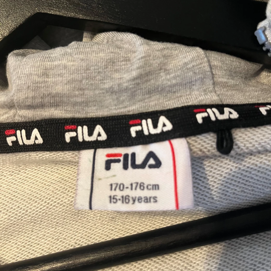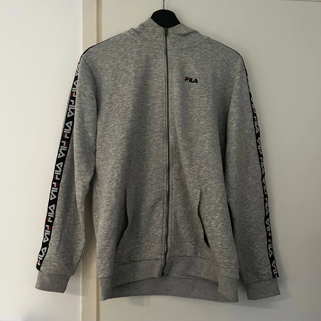 Säljer en grå hoodie från FILA med dragkedja och logotyp längs ärmarna. Perfekt för en sportig look eller avslappnad stil. Den har långa ärmar och en bekväm passform.