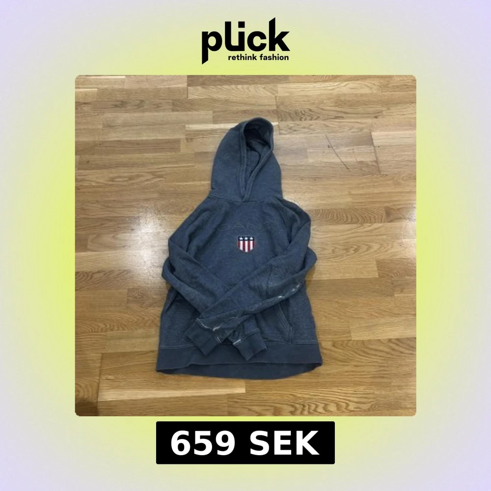 Säljer en stilren grå hoodie från GANT med broderad logga och emblem på bröstet. Tröjan har långa ärmar och en klassisk känguruficka framtill. Perfekt för en avslappnad look.