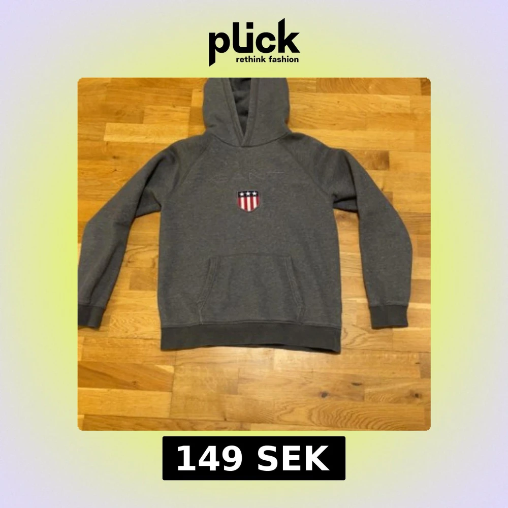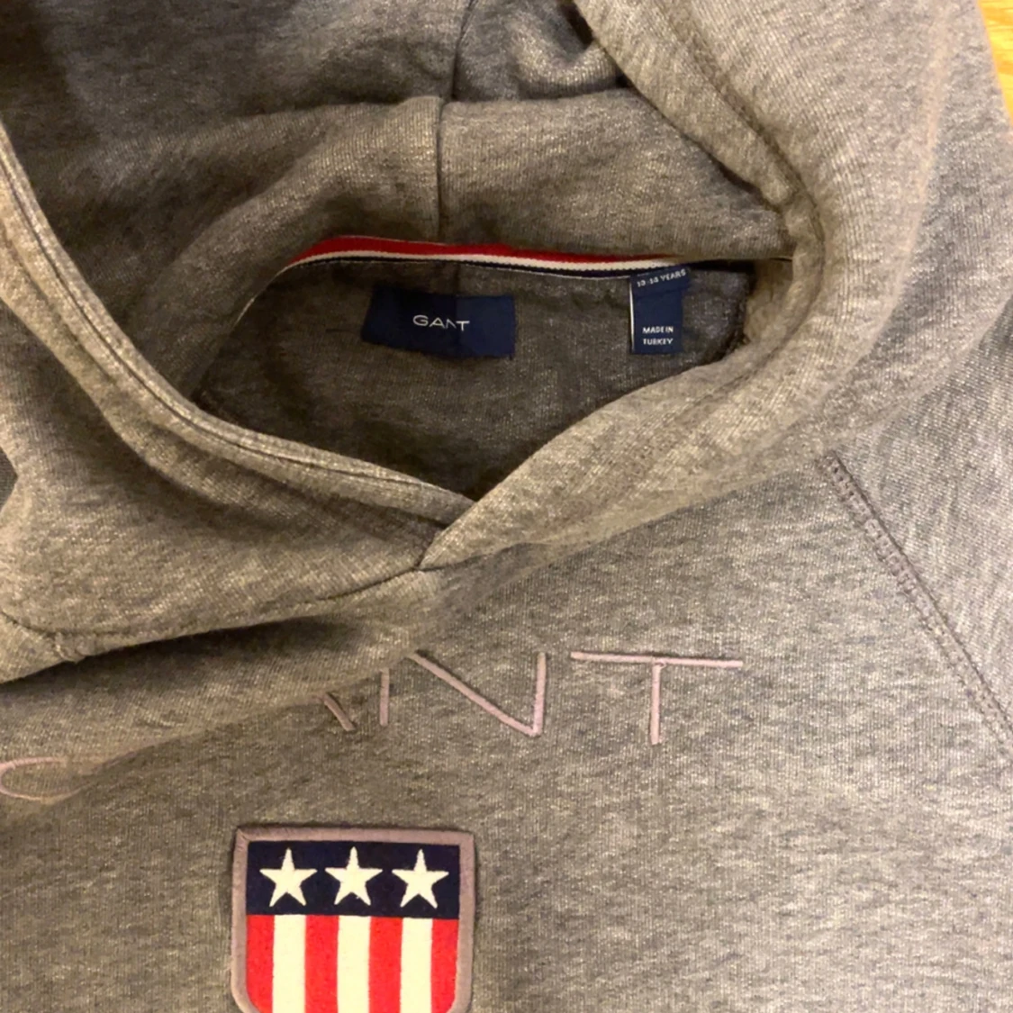 Säljer en grå hoodie från GANT med broderad logga och ett sköldmärke med stjärnor och ränder på bröstet. Tröjan har huva och en stor magficka framtill. Perfekt för en avslappnad stil.