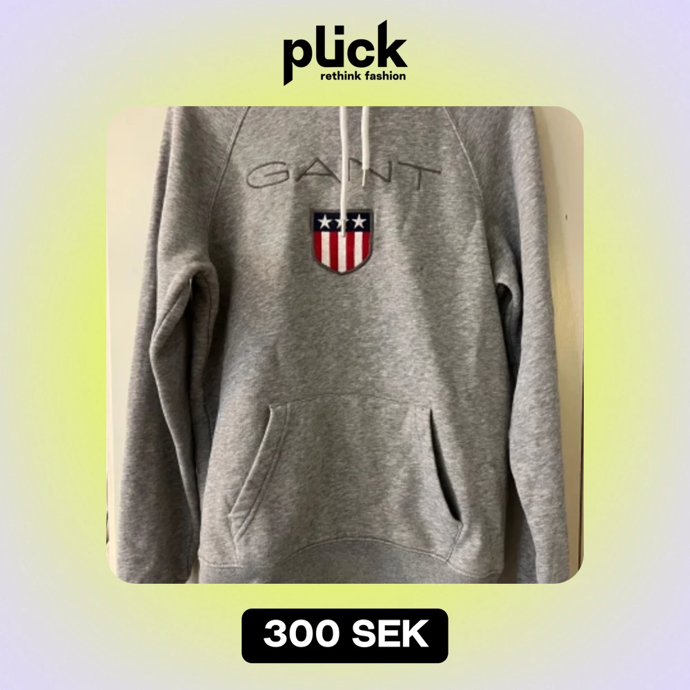 Säljer en snygg och bekväm grå hoodie från GANT. Den har en broderad logga och ett coolt emblem på framsidan. Perfekt för en avslappnad stil med känguruficka och justerbar huva. Passar perfekt till både vardag och chill. Jättefint skick