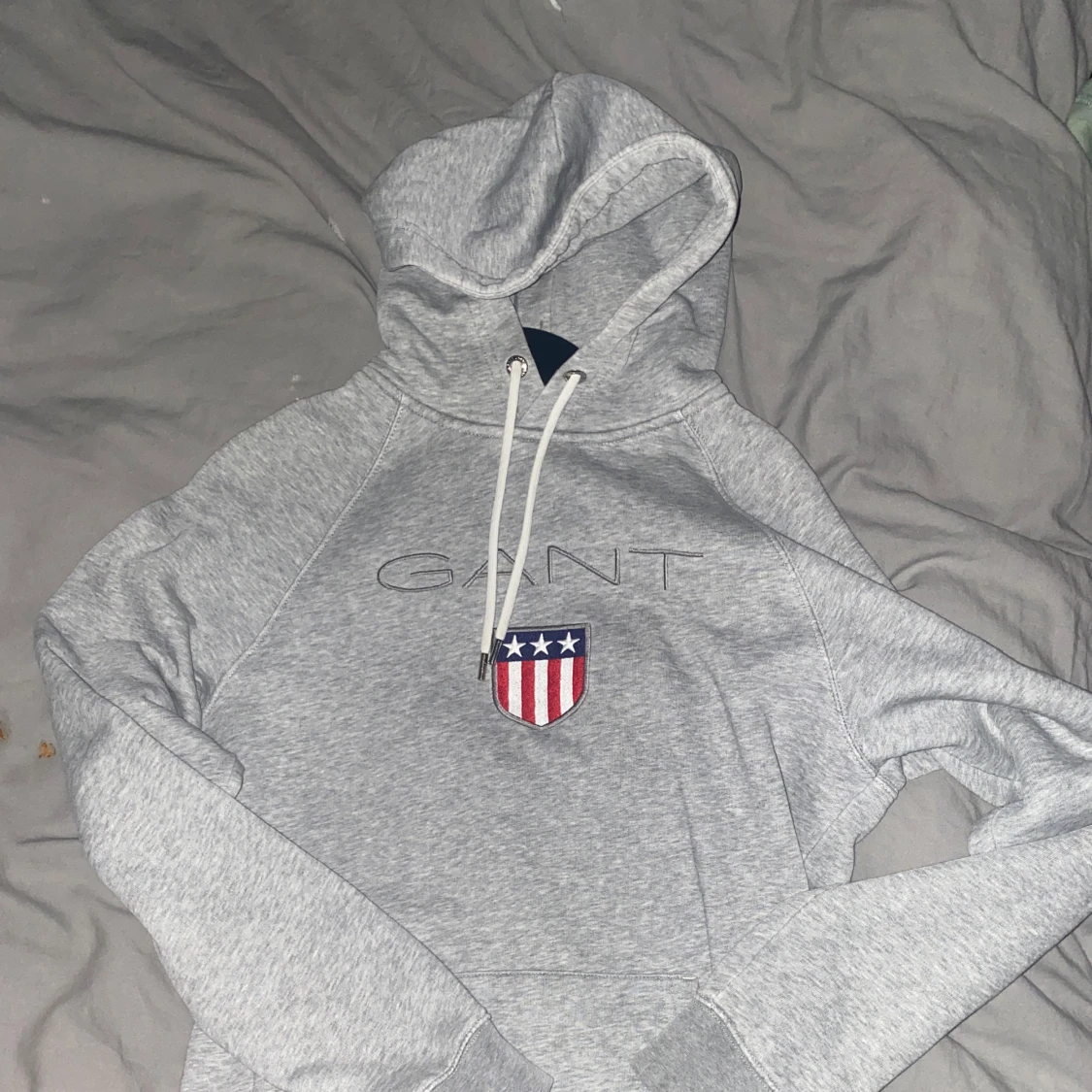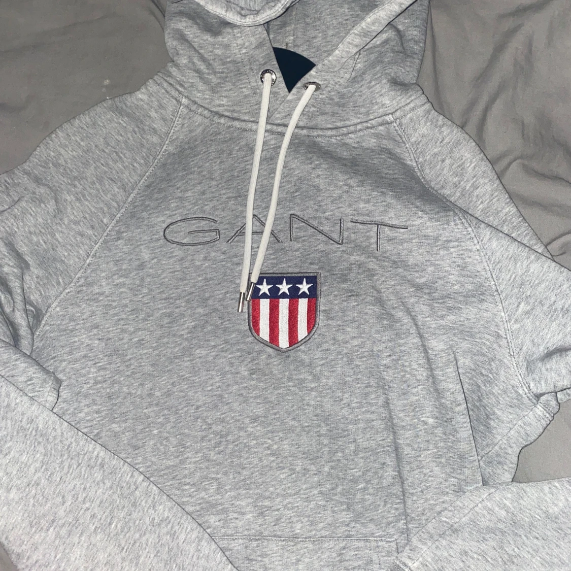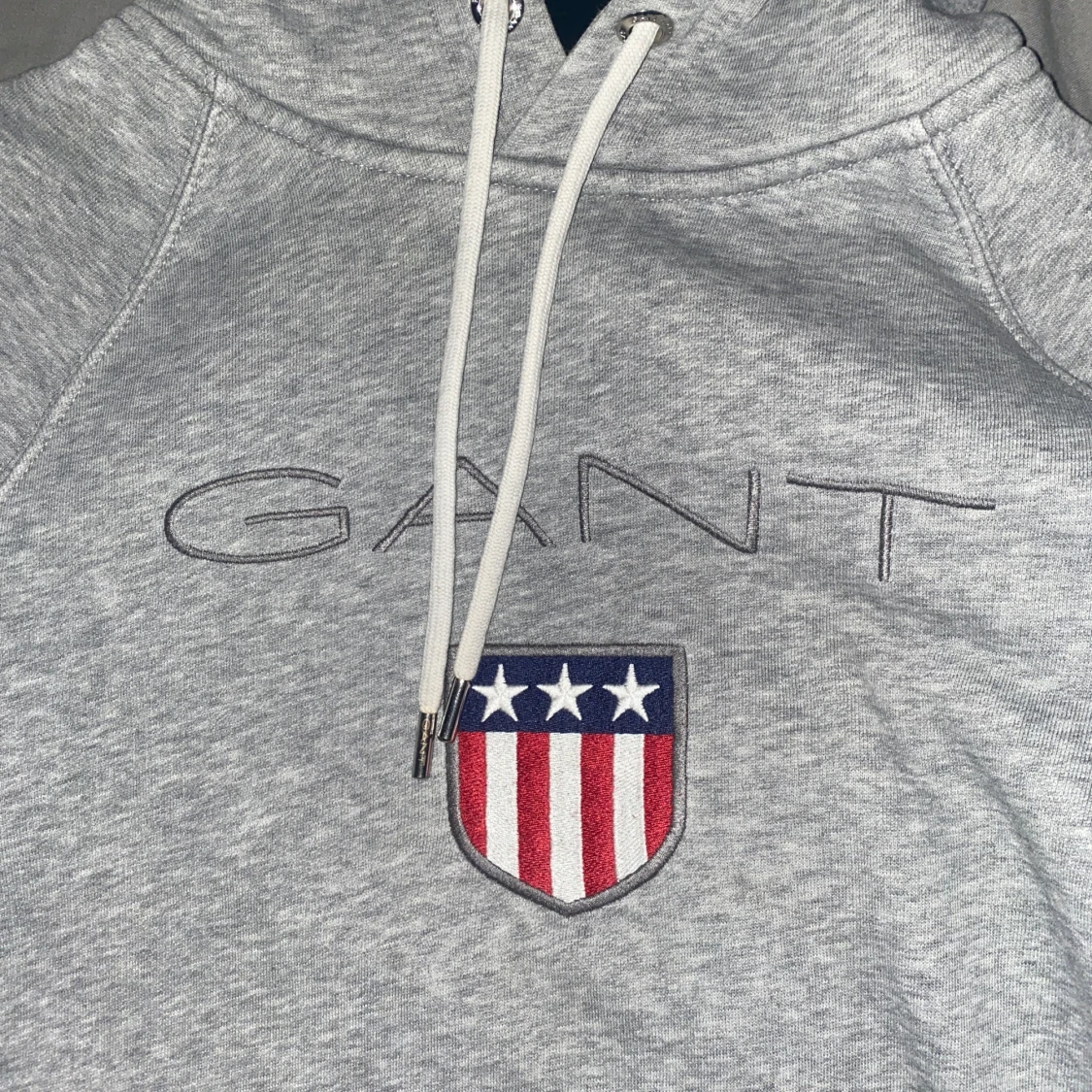 Säljer en stilren grå hoodie från GANT med broderad logga och ett emblem med stjärnor och ränder på bröstet. Tröjan har en justerbar huva med vita snören och långa ärmar. Perfekt för en avslappnad stil.