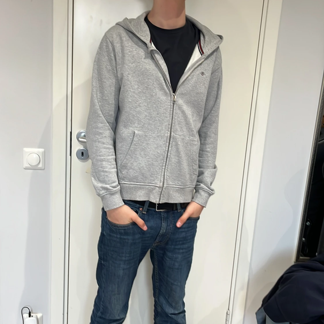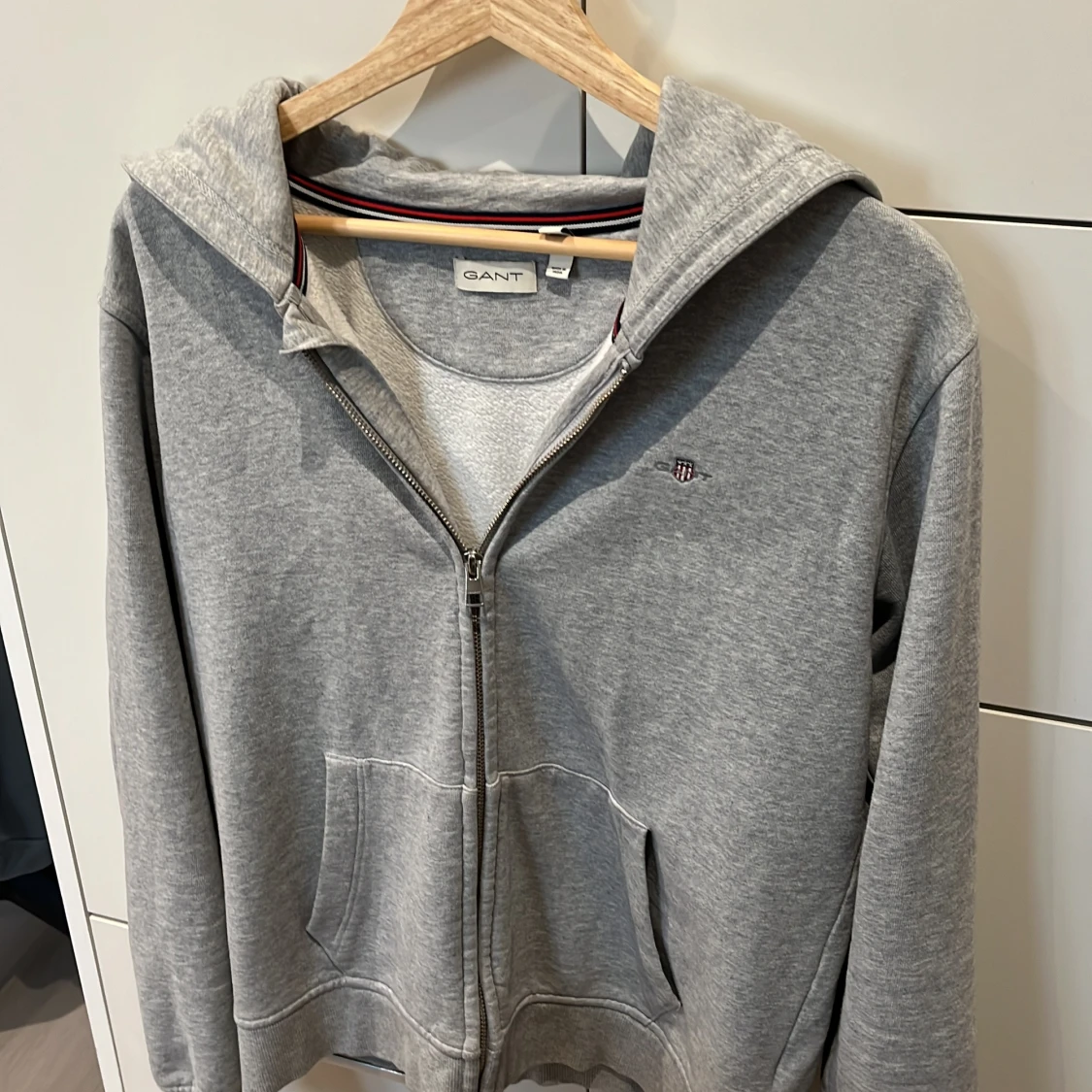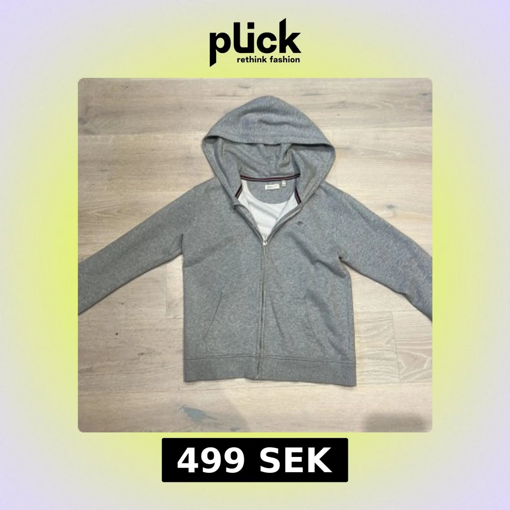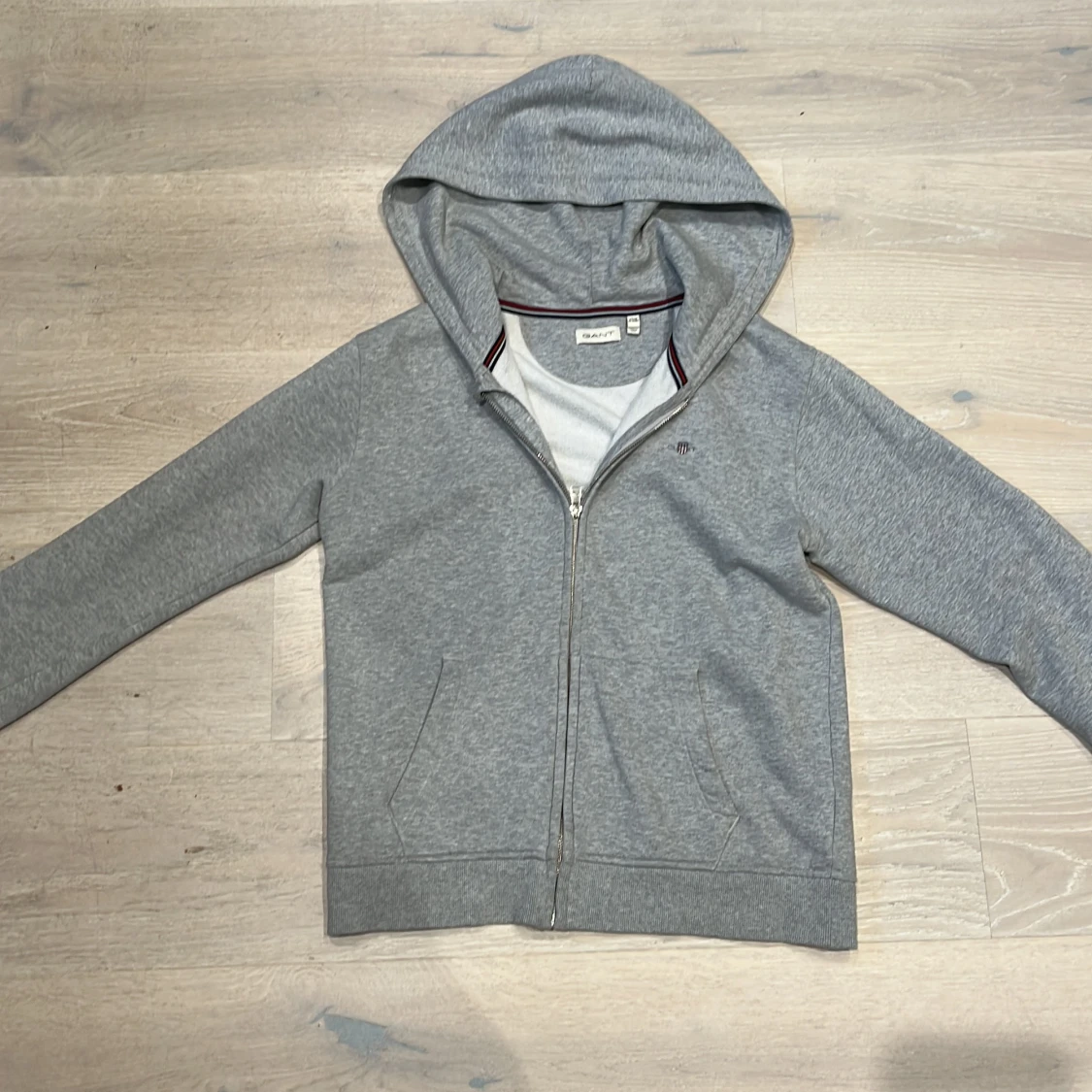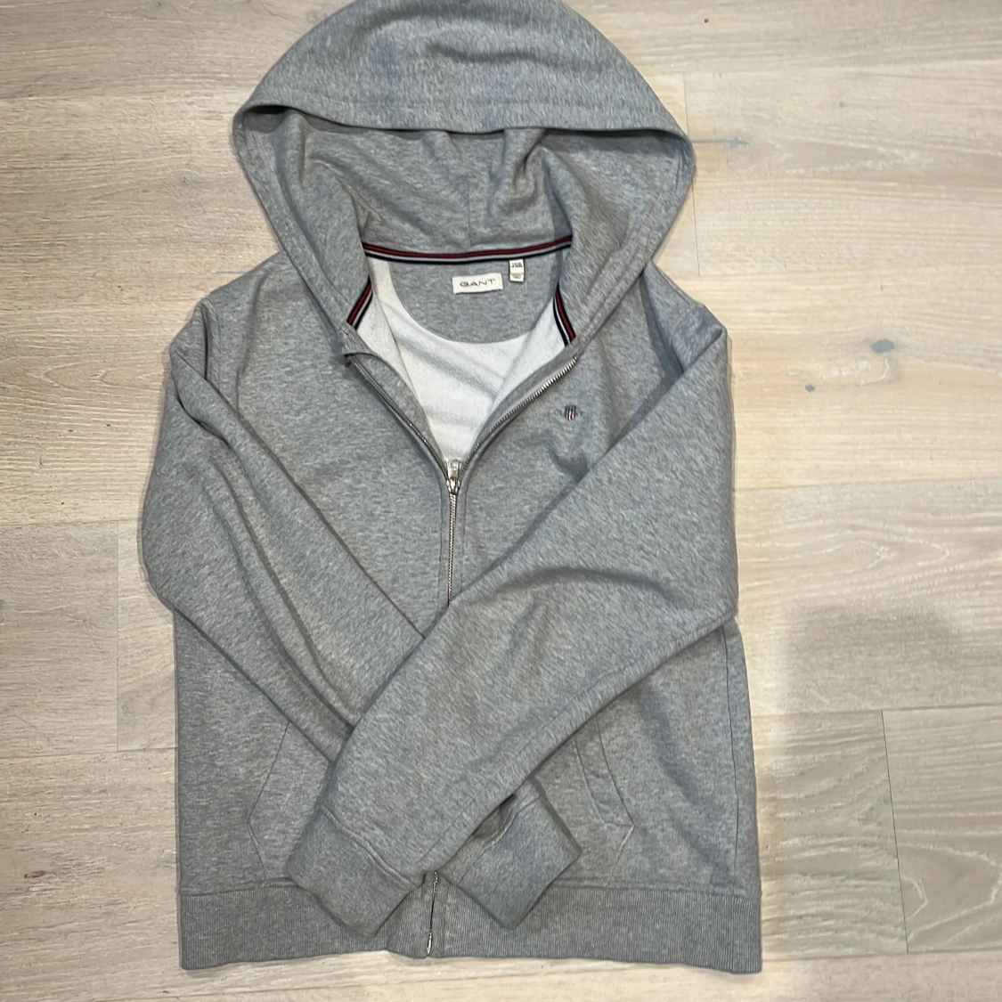 Säljer en stilren grå hoodie från GANT med dragkedja och två fickor framtill. Den har en klassisk design med ribbade muddar och en liten logga på bröstet. Perfekt för en avslappnad look.