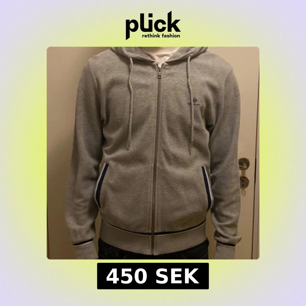 Snygg grå hoodie från Gant i storlek S. Tröjan har huva med snörning, hel dragkedja och två fickor med blå och vit kant. Ribbad nederkant och ärmslut med blå detalj. Perfekt för chill dagar och enkel att matcha med jeans.
