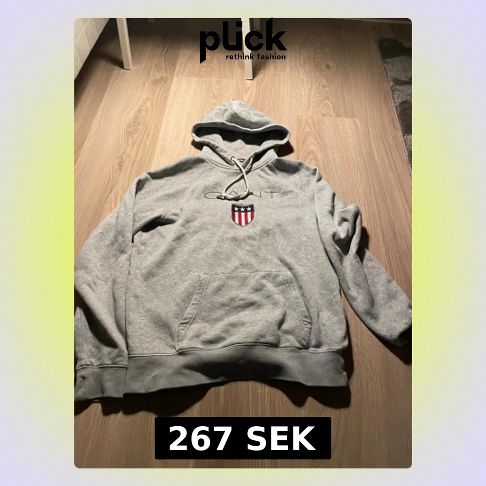 Säljer en grå hoodie från GANT i storlek L. Tröjan har huva med snörning, stor ficka framtill och broderad GANT-logga med sköld på bröstet. Tillverkad i mjuk bomull, perfekt för chill dagar. Klassisk och stilren design.