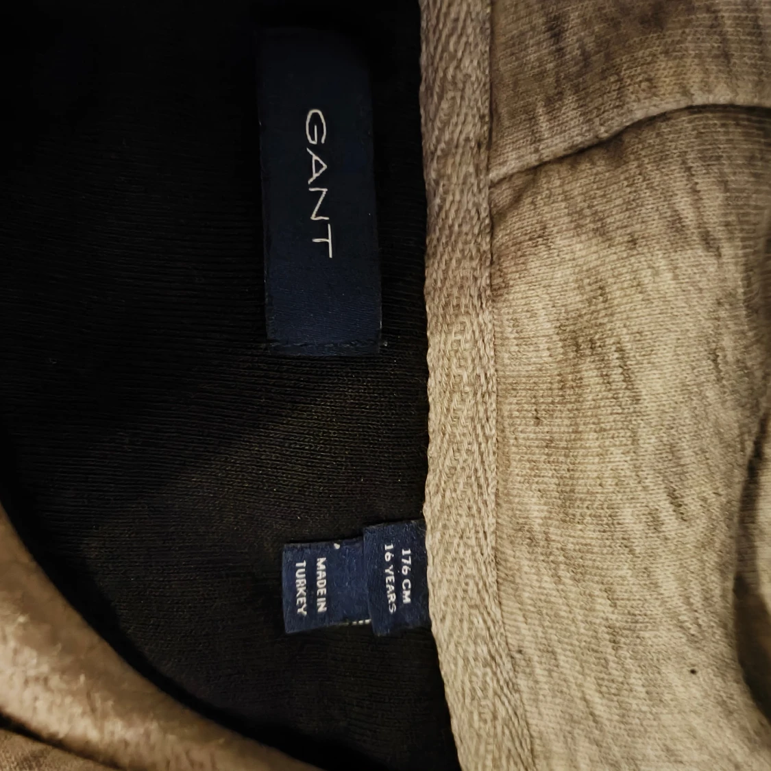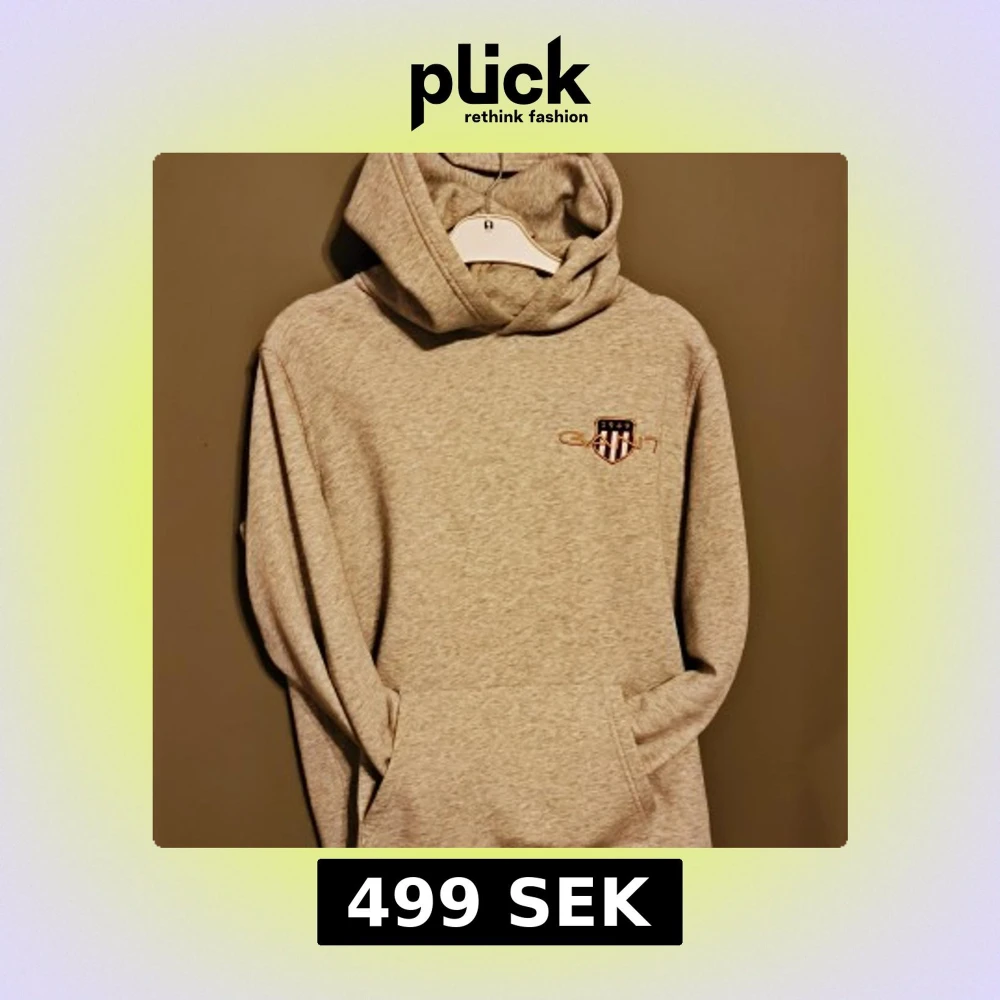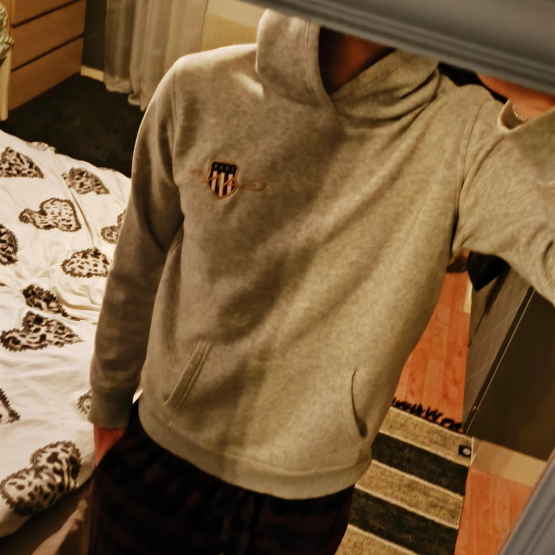 Säljer en grå hoodie från GANT med broderad logga och emblem på bröstet. Tröjan har huva, magficka och långa ärmar. Mjuk och skön i bomullsmix, perfekt för chill dagar. Passar dig som gillar klassisk streetstyle och enkel design. Hoodien passar folk med S/M