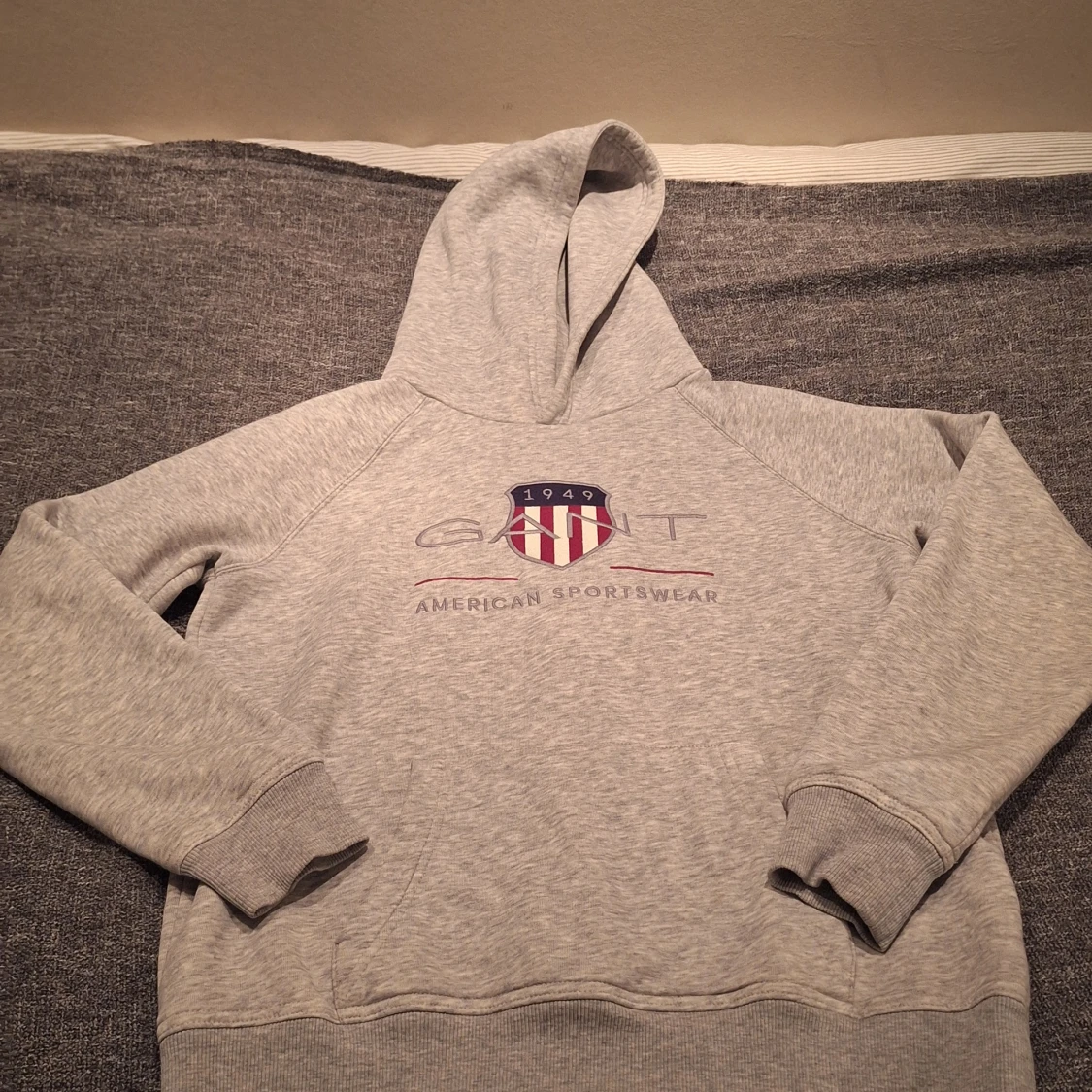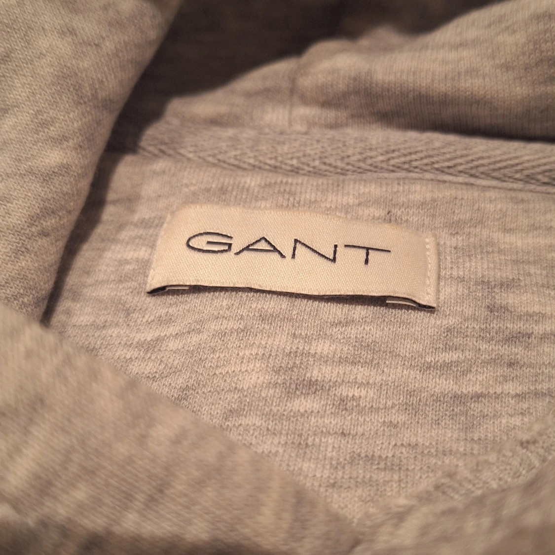 Snygg ljusgrå hoodie från GANT med klassiskt tryck och logga på bröstet. Har andvänt tröjan endast 1 gång. Tröjan har huva, ribbade muddar och är tillverkad i mjuk bomullsmix. Perfekt för en chill och sportig stil.