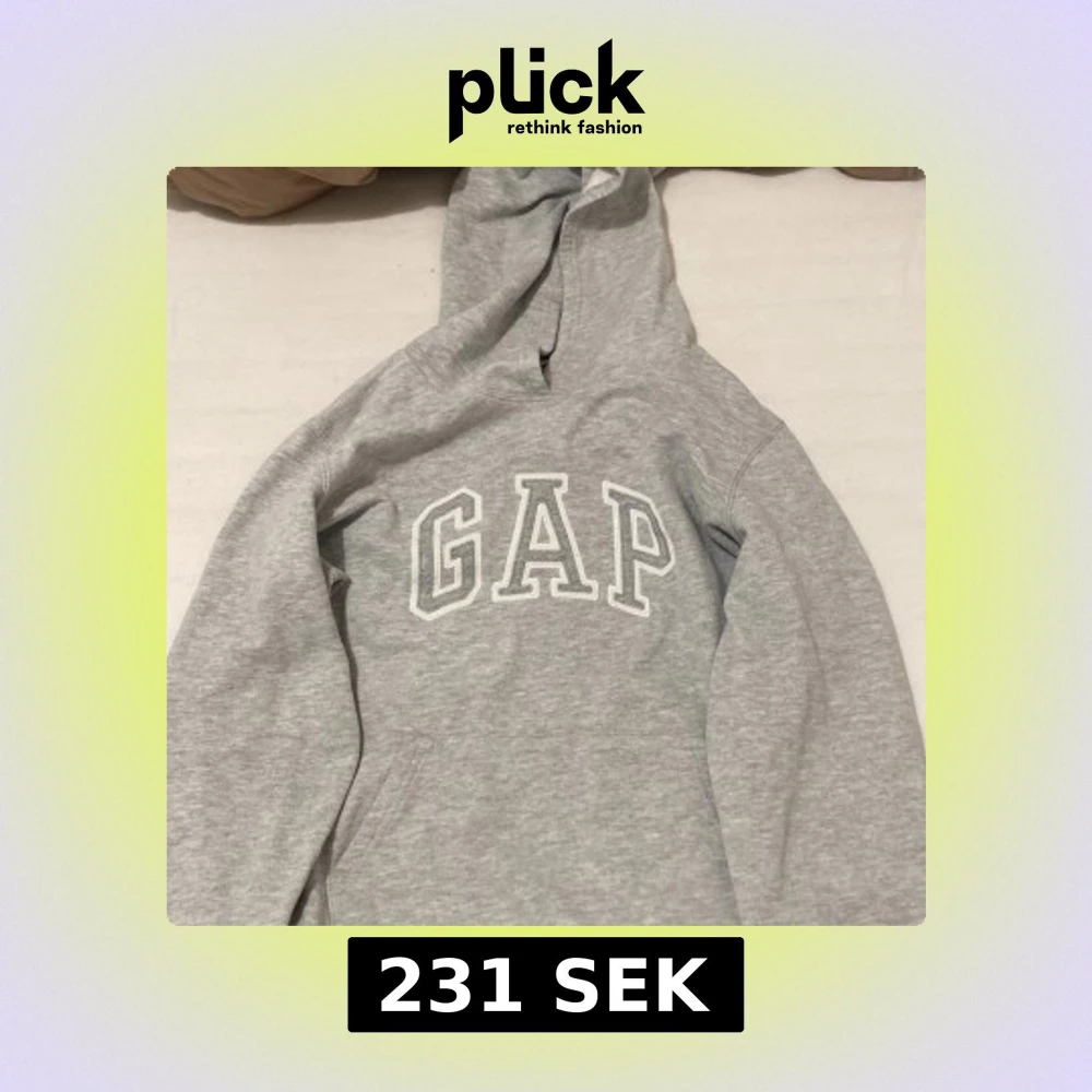 Säljer en klassisk grå hoodie från GAP med stor logga på bröstet. Tröjan har en bekväm passform och en praktisk magficka. Perfekt för en avslappnad stil. Jag är 1,54 lång och tror att det är en barnstorlek