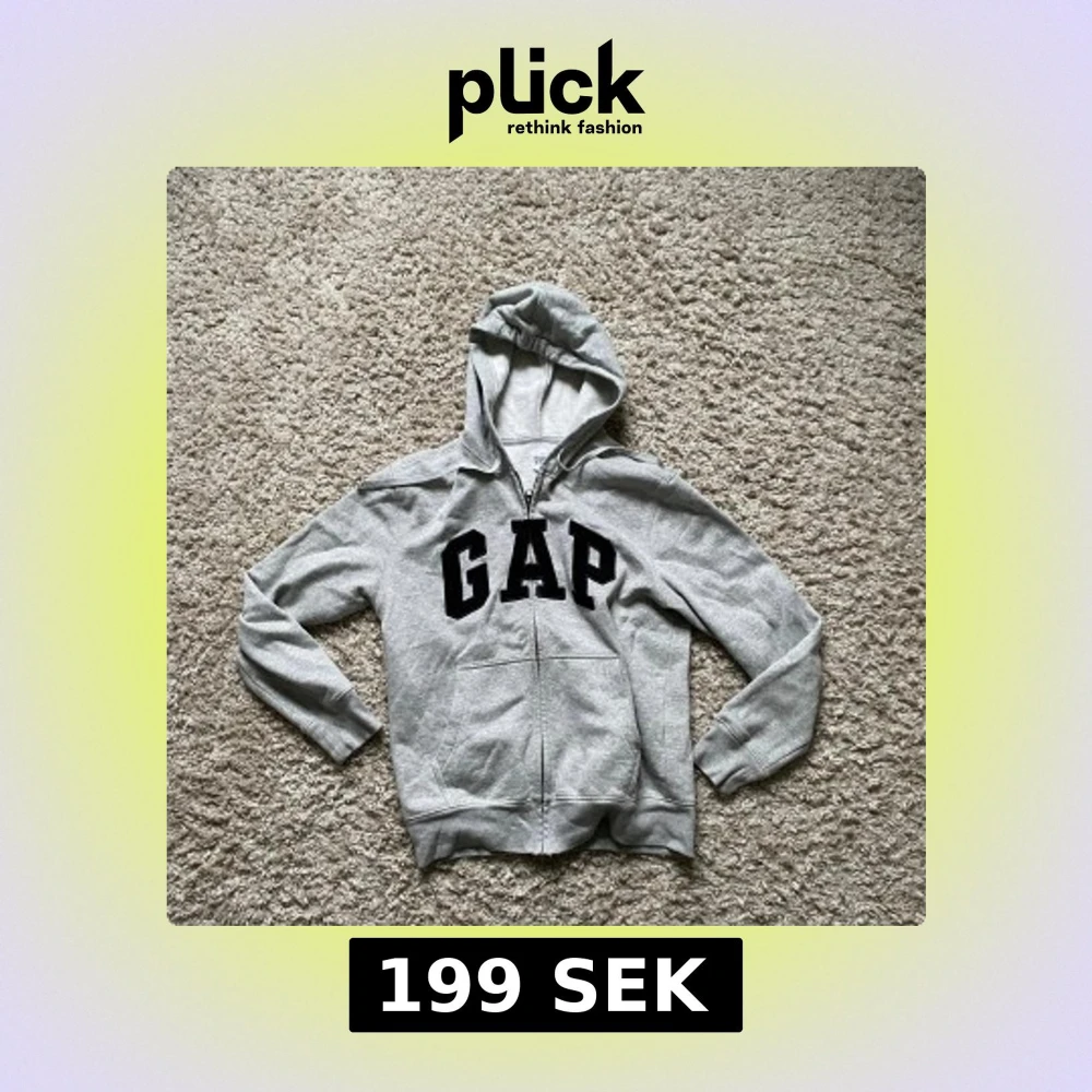Säljer en grå hoodie från GAP i storlek S med svart GAP-tryck på bröstet. Tröjan har huva med snörning, två fickor fram och dragkedja. Mjuk insida i fleece och klassisk loose passform.