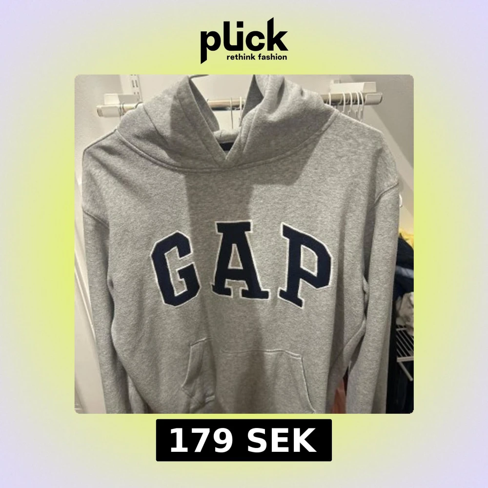 Säljer en klassisk grå hoodie från GAP med stor, mörkblå broderad logga på bröstet. Tröjan har huva och en stor magficka framtill. Perfekt för chill dagar och enkel att matcha med jeans eller joggers. Basic hoodie! Fråga gärna om fler bilder! Kom gärna med förslag på pris !